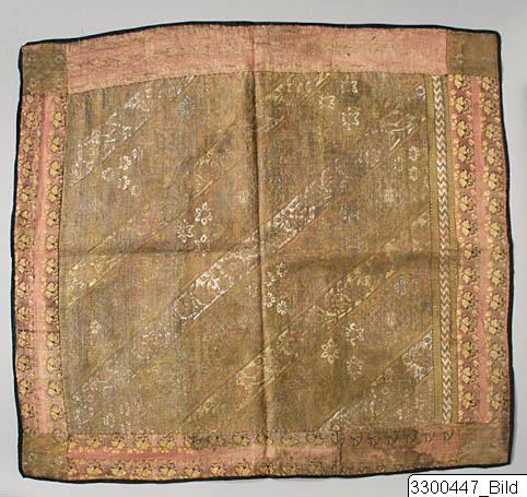 Central piece with diagonally set registers representing floral scrolls, with a board of a zigzag register inbetween two registers composed of small squares. Colors today are pale golden brown, mustard yellow, orange and white. Boardings are in a pink silk with yellow flowers with darker bords. In corners, square pieces of a cloth close to the sentral one (cf, MMI 1980:09)