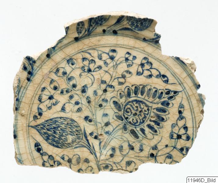 Fragment of large globular bowl, thick wall, squat ring base with angular foot, roughly made underside. Decoration: Interior: Sinisant vegetal motif in tondo, peonies (?) flowers on fine curving stems, the flowers are mostly white with a blue outline, but feature small zones of hatching and dots of blue; two prominent tear-shaped leaves, one infilled with rows of "Vs", the other almost pseudo-epigraphic curves, this leaf is surrounded by round appendages infilled with solid oblongs of blue; tondo encircled by two fine parallel blue bands, a space of ca 1.5cm, two more bands and then fragmentary vegetal scene involving various leaves infilled with V's and dots, where the leaves join the parallel bands large solid dots of blue are employed (possibly echoing Chinese heap and dot technique, NC). Exterior: thicker parallel blue bands furthest distance from base. Friable white stonepaste fabric. Ware: Clear glaze cob UGP.