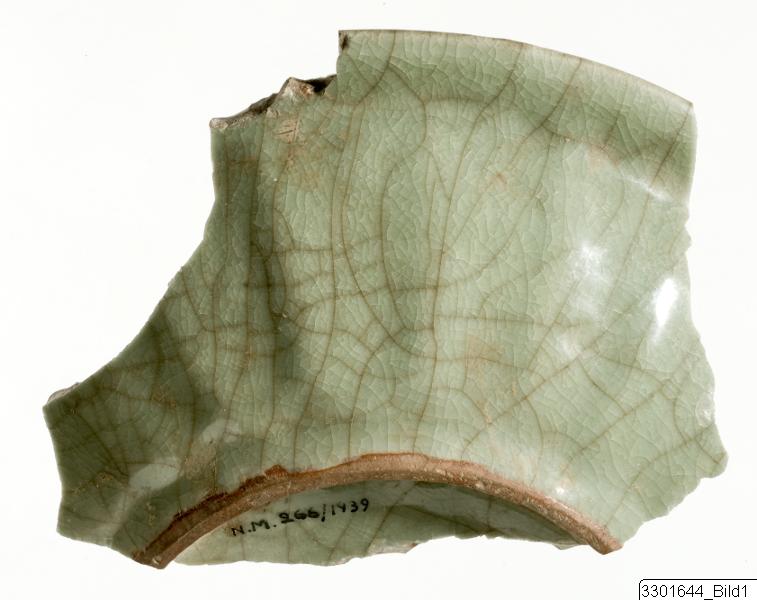 Hemispherical bowl with slightly kicked ledge rim and ring base with deep well and squared interior profile. Exterior has broad fluting. Decoration: Fish motif in raised relief edge of interior tondo. Transparent feldspathic glaze. Grey stoneware. Ware: Celadon.