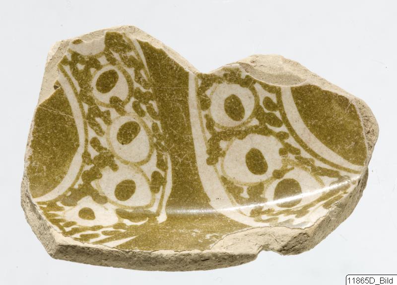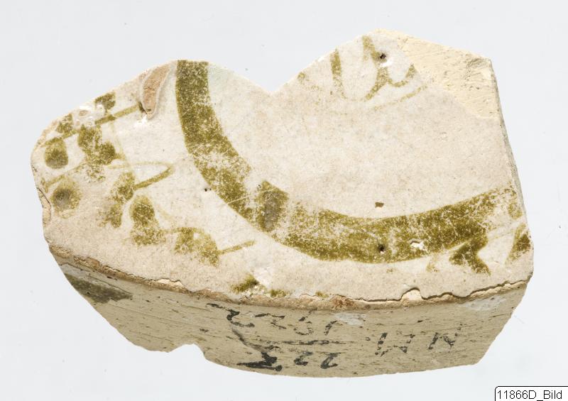 Fragment av ett kärl med en kölformad öppen form. Ogenomskinlig, vit glasering. Dekoration: geometrisk inre och yttre, inkluderar cirklar och prickar, klotter och tjocka block av färg. Tätt blekgult gods, små mörka korn.