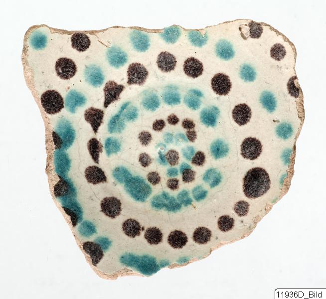 Fragment av en skål, osäker form, vertikal ringbotten med en kvadratisk profil. Klar glasering över den vita slickern. Dekoration: Två koncentriska spiraler av tjocka droppar av mangan (brun) och kopparoxid (grön) som blir mindre mot mitten; i låg relief. Skört blekt rödaktigt gods, vita korn.
