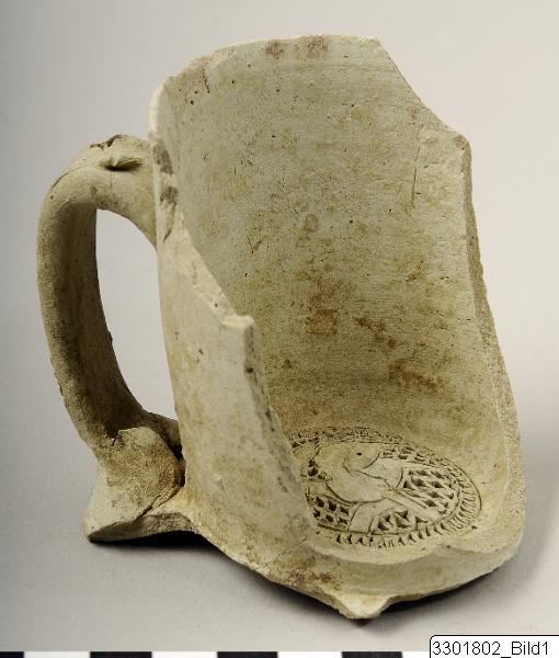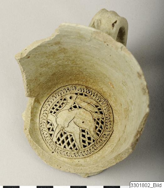 • Fragment of a filter jug. Vertical ear-handle. Filter: Hare depicted in reserve facing left. Fine gritty grey ware.