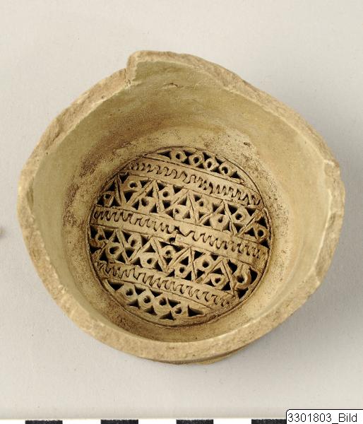 • Fragment of a filter jug with splaying sides. Filter: parallel borders where every second is filled with a curved line, the others with rosettes. Fine gritty grey ware.