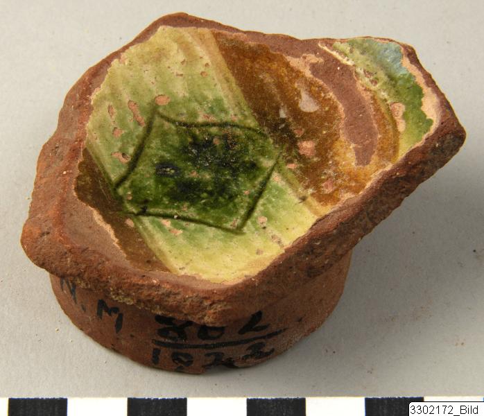 • Base and lower part of body. Rather high ring-base. Tondo decorated with a green square on light green background, surrounded by brown. Red clay.