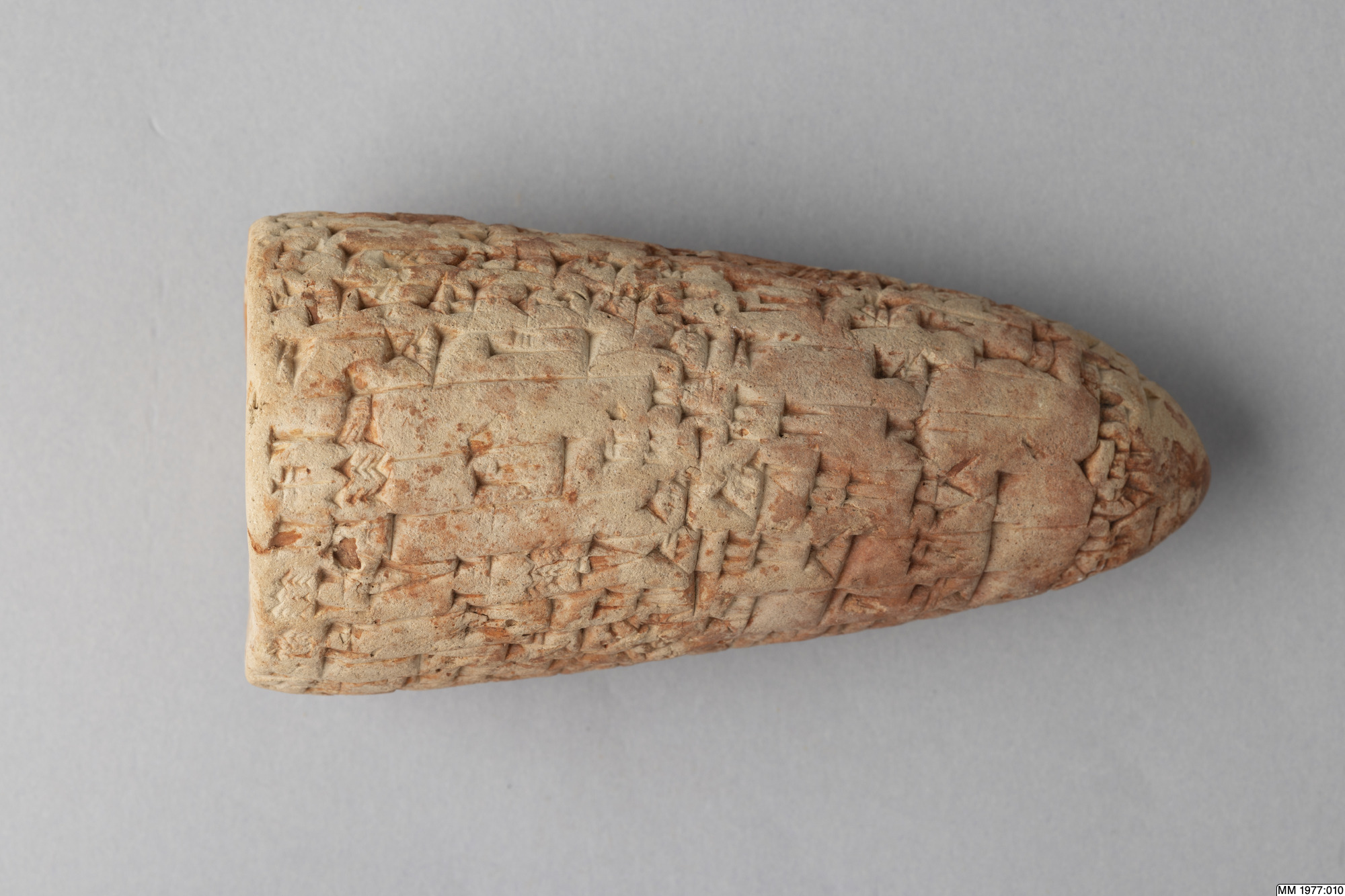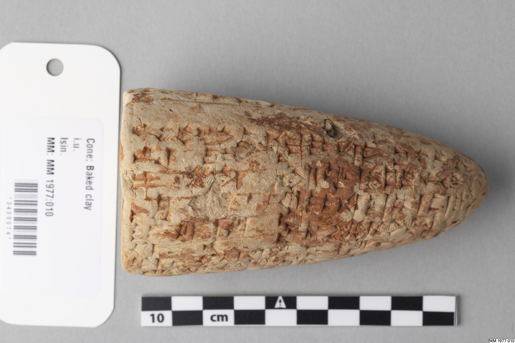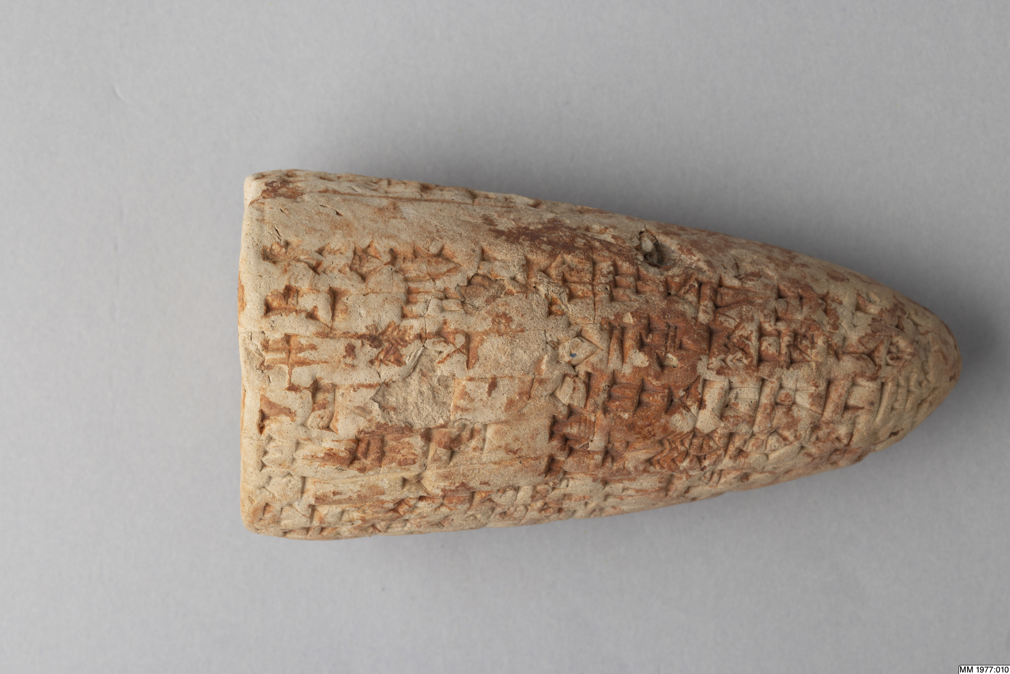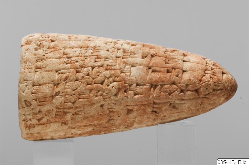 The clay cone is inscribed with an Akkadian inscription of Lipit-Ishtar, the fifth king of the Dynasty of Isin (1934-1924 BC). In the publication by D.R. Frayne, 58 other clay cones inscribed with the same text are listed. Five of these clay cones were recently excavated by the German expedition to the city Isin, the others are without recorded provenance. The inscription deals with the construction by Lipit-Ishtar of a pair of pot stands at the gate of the palace. All these clay cones were probably once placed in the walls of this gate of the palace in Isin. Translation: “I, Lipit-Ishtar, the humble shepherd of Nippur, true farmer of Ur, unceasing (provider) for Eridu, lord suitable for Uruk, king of Isin, king of the land of Sumer and Akkad, favourite of the goddess Ishtar, fashioned a pair of pot stands, a gift (for) the arms of the gods Enlil and Ninlil, in Isin, the city of my kingship, at the palace gate, when I, Lipit-Ishtar, son of the god Enlil, had established justice in the land of Sumer and Akkad.”