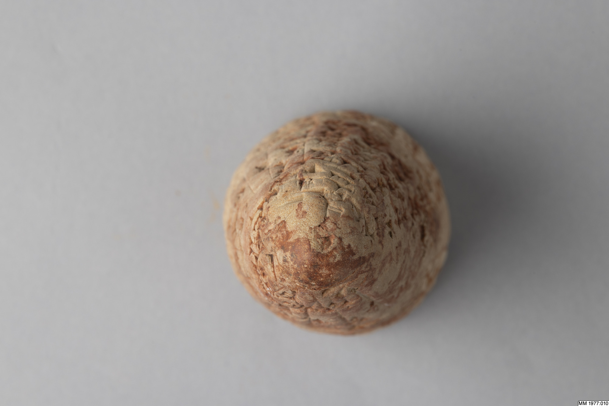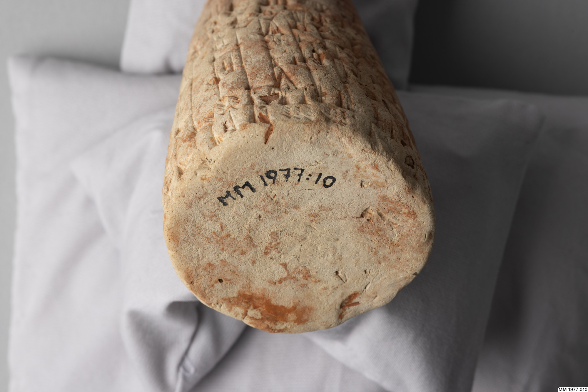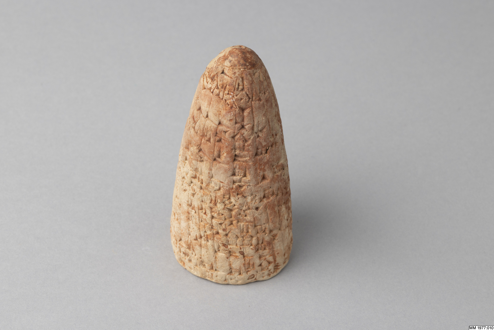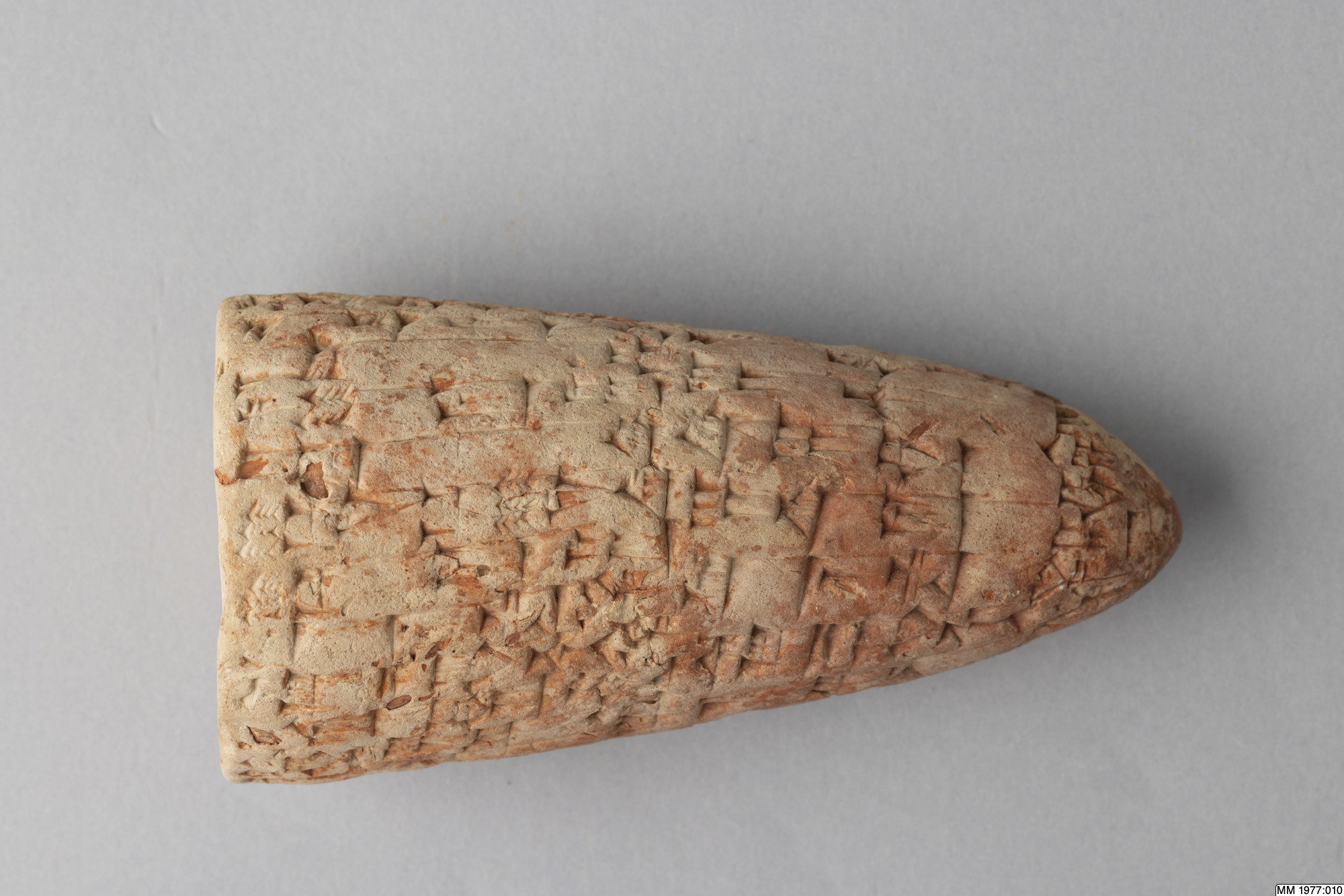 The clay cone is inscribed with an Akkadian inscription of Lipit-Ishtar, the fifth king of the Dynasty of Isin (1934-1924 BC). In the publication by D.R. Frayne, 58 other clay cones inscribed with the same text are listed. Five of these clay cones were recently excavated by the German expedition to the city Isin, the others are without recorded provenance. The inscription deals with the construction by Lipit-Ishtar of a pair of pot stands at the gate of the palace. All these clay cones were probably once placed in the walls of this gate of the palace in Isin. Translation: “I, Lipit-Ishtar, the humble shepherd of Nippur, true farmer of Ur, unceasing (provider) for Eridu, lord suitable for Uruk, king of Isin, king of the land of Sumer and Akkad, favourite of the goddess Ishtar, fashioned a pair of pot stands, a gift (for) the arms of the gods Enlil and Ninlil, in Isin, the city of my kingship, at the palace gate, when I, Lipit-Ishtar, son of the god Enlil, had established justice in the land of Sumer and Akkad.”