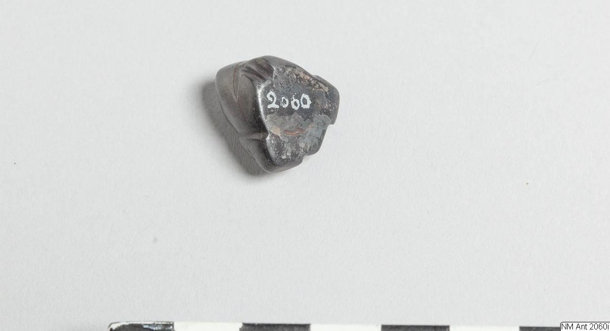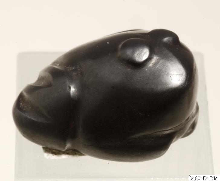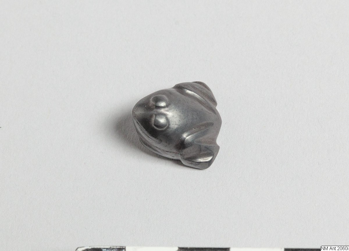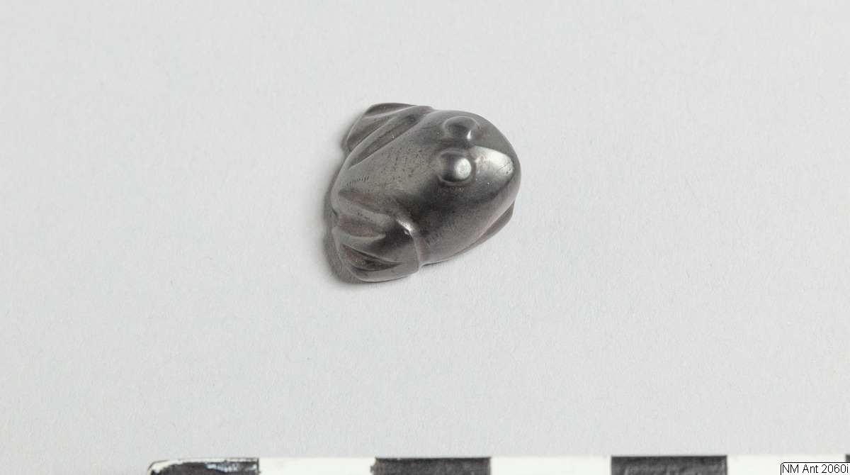 • Weight or amulet in the shape of a squatting frog. Eyes as small protuberances on the top of the head. Mouth marked by indented line. No base engraving. Opaque, highly polished, metallic black hematite.