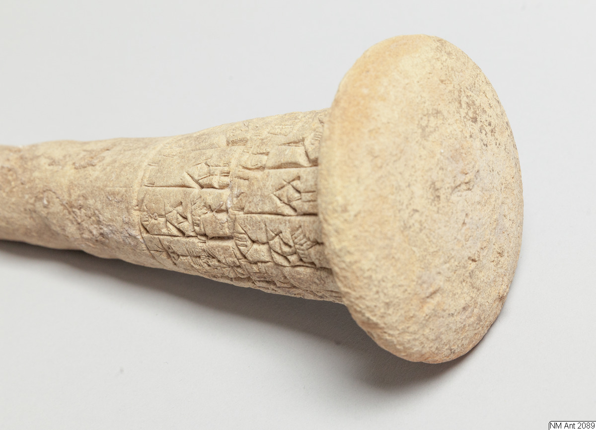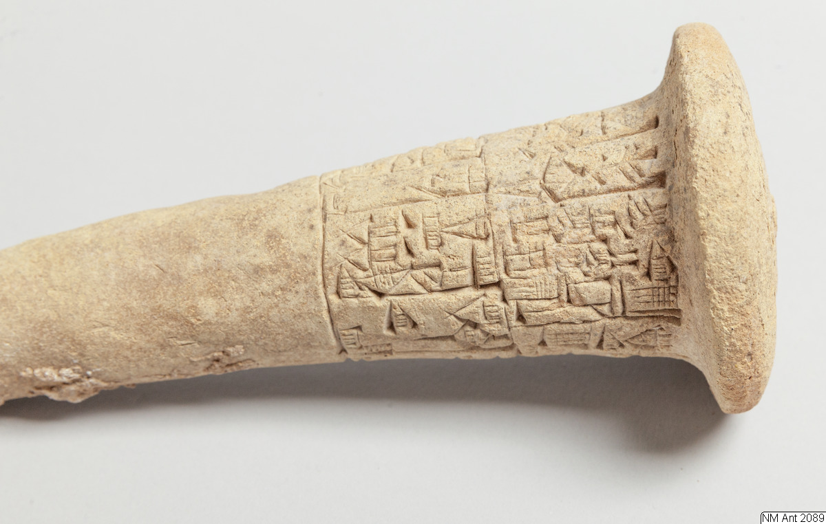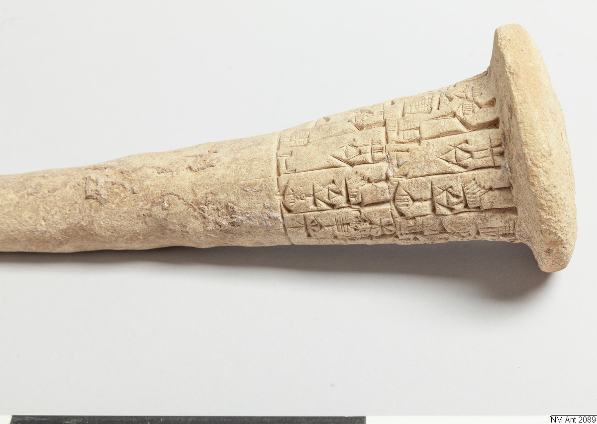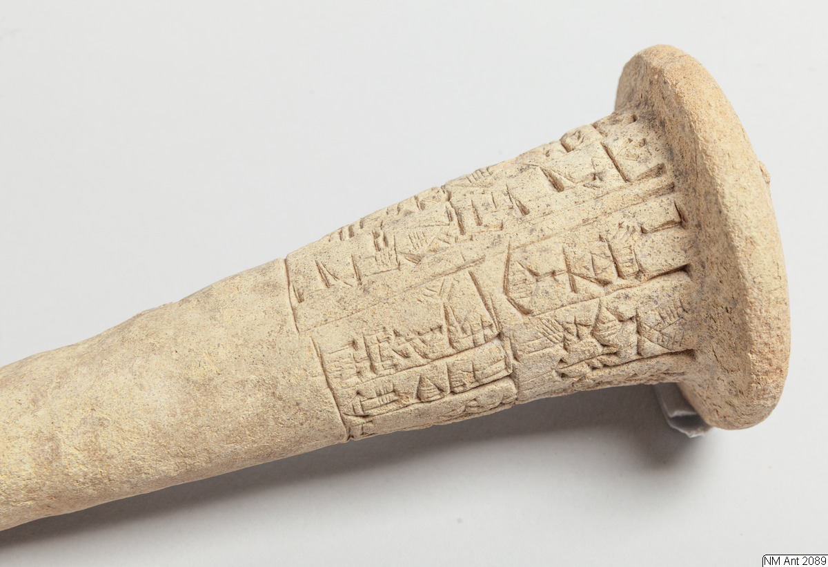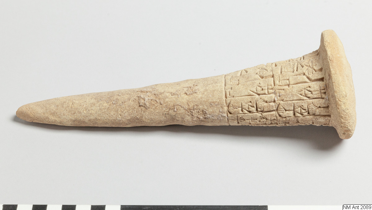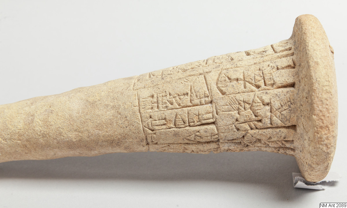 One of building cones from different temples at Girsu (Tello) with Sumerian inscriptions of the ruler Entemena. This and MM 1977:11 are inscribed with the same inscription (with minor variants noted in the transliteration below) of Entemena (also read Enmetena), who ruled the city-state Lagash c. 2450 BC. This city-state consisted of the main cities Lagash (Modern Al-Hiba) and Girsu (Modern Tello), as well as some other cities. According to our text also the city Badtibira belonged there, at least for some period. In the publication by H. Steible 40 clay cones (including our two clay cones) inscribed with this text are listed. Two of these clay cones are known to have been excavated in Badtibira (Modern Madain), all the others are without recorded provenance. The inscription deals with the construction by the ruler Entemena of the temple for the goddess Inanna and the god Lugal-Emush. The temple was called Emush; it was situated in the city Badtibira. Our two clay cones together with all the duplicates were probably once placed in the walls of this temple. Translation: “For the goddess Inanna and the god Lugal-Emush, Entemena, the ruler of Lagash, built the Emush, their beloved temple, and ordered these clay cones for them. Entemena, who built the Emush, his (personal) god, is the god Shulutul. At that time Entemena, ruler of Lagash, and Lugal-kigine-dudu, ruler of Uruk, established brotherhood.”