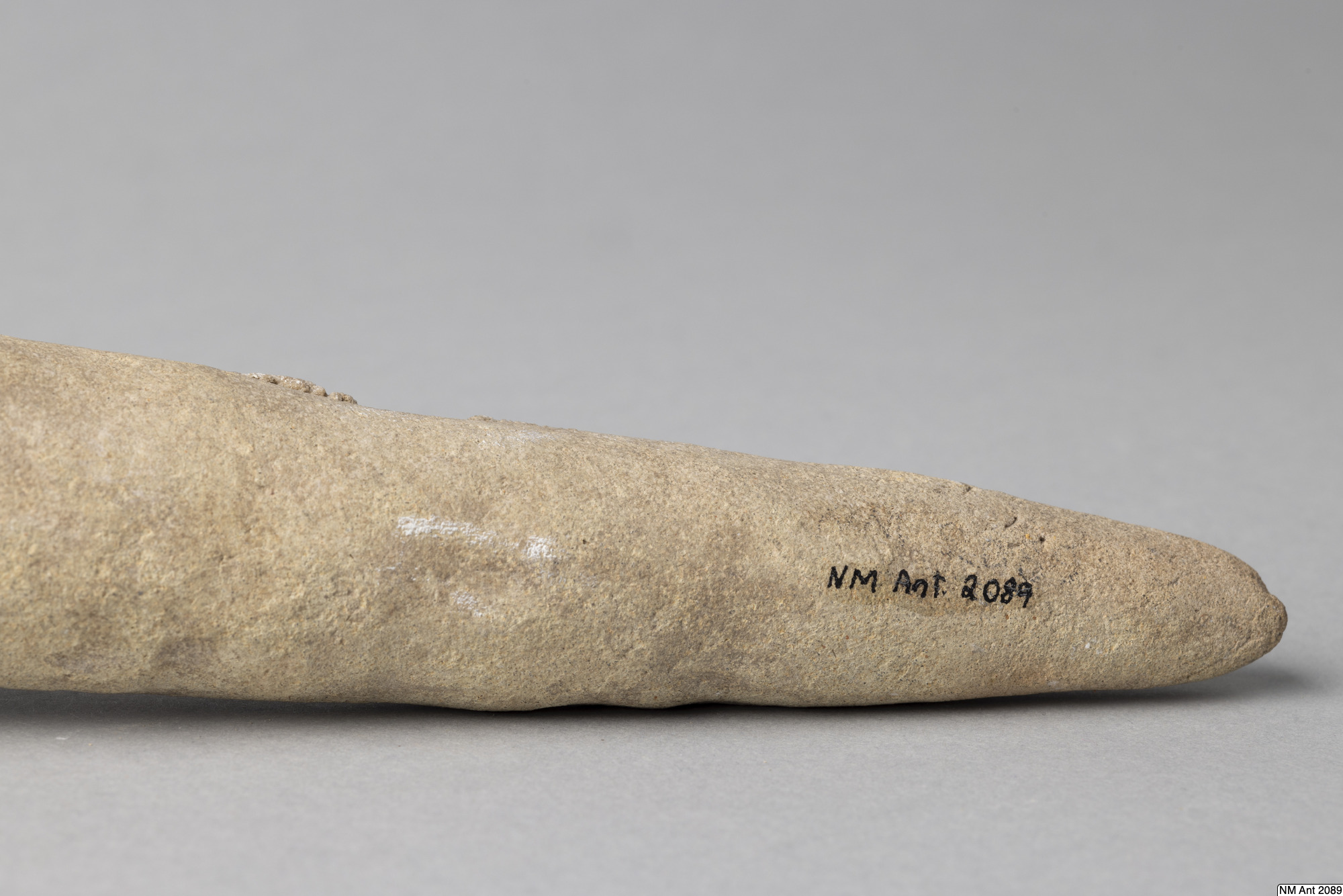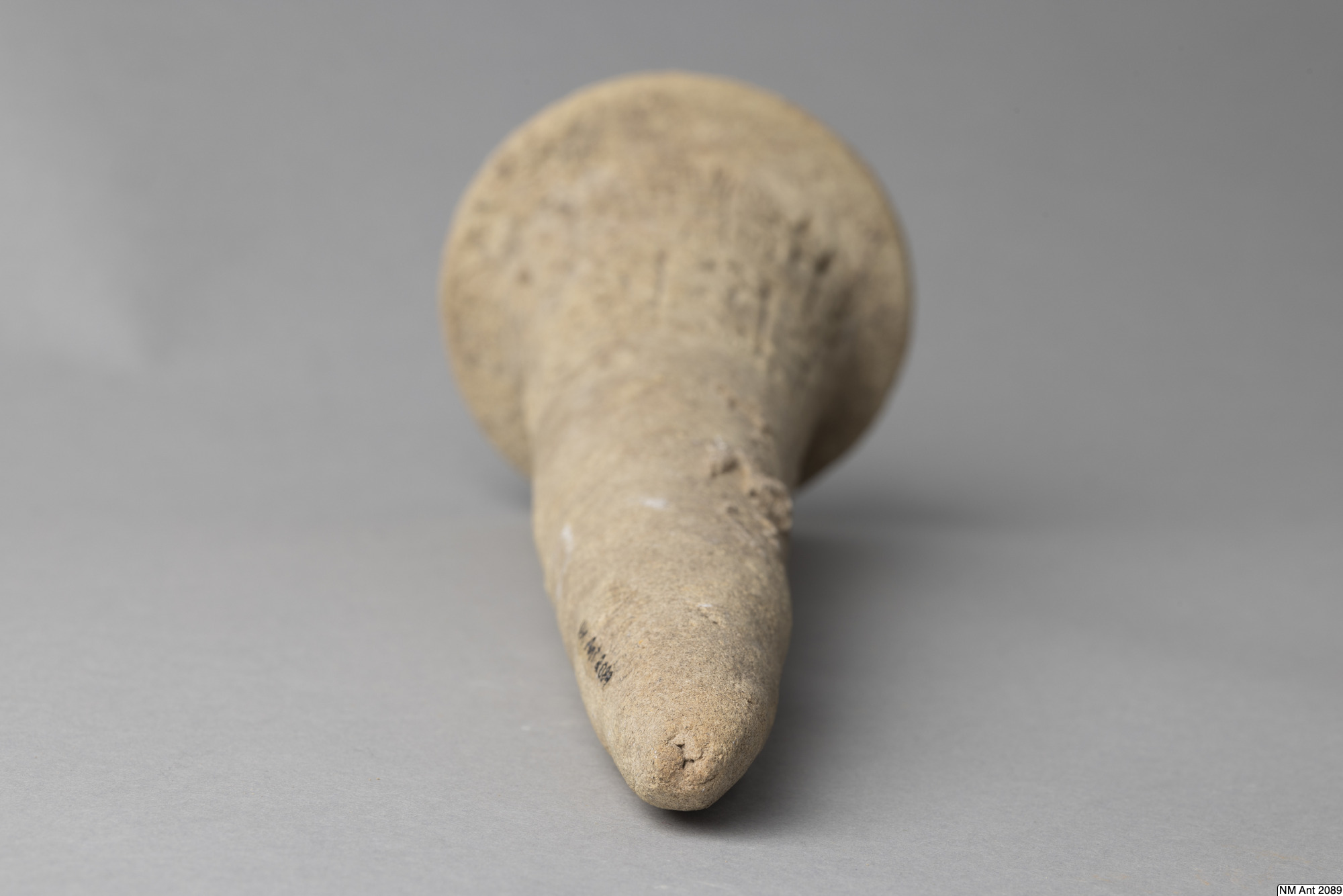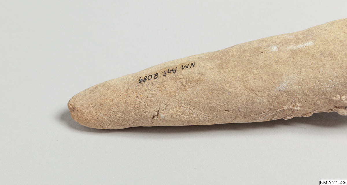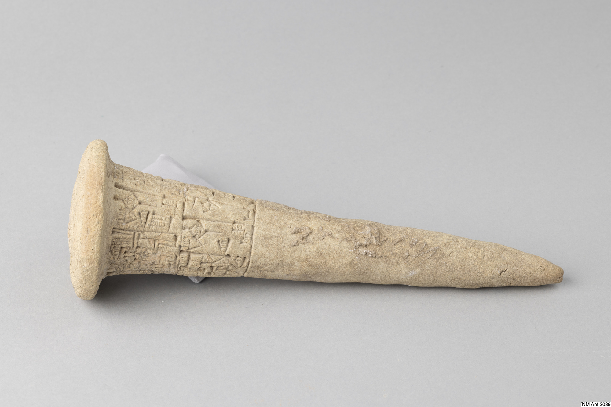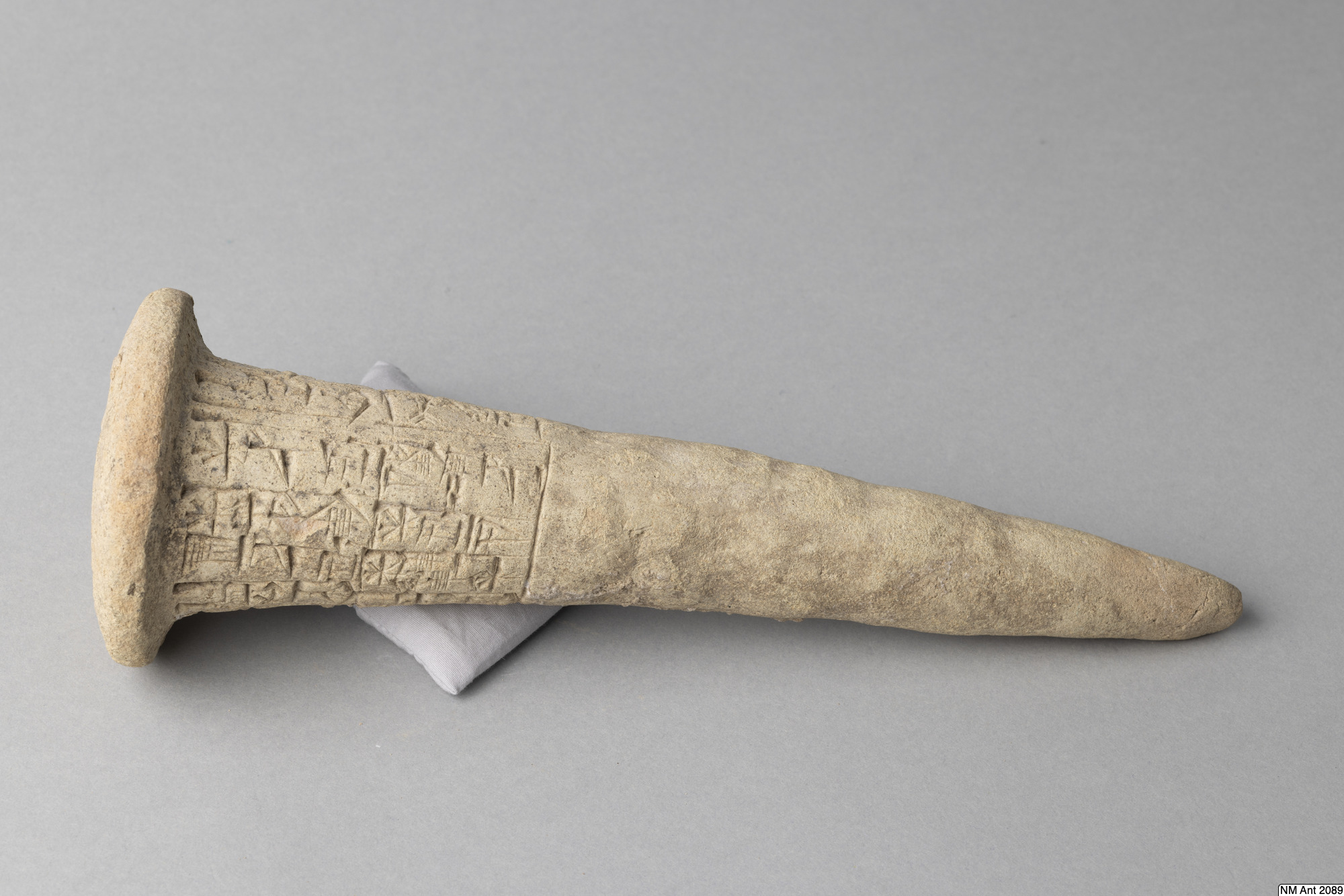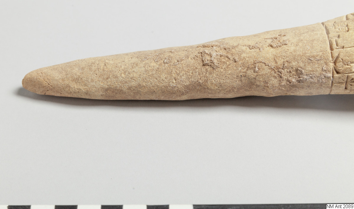 One of building cones from different temples at Girsu (Tello) with Sumerian inscriptions of the ruler Entemena. This and MM 1977:11 are inscribed with the same inscription (with minor variants noted in the transliteration below) of Entemena (also read Enmetena), who ruled the city-state Lagash c. 2450 BC. This city-state consisted of the main cities Lagash (Modern Al-Hiba) and Girsu (Modern Tello), as well as some other cities. According to our text also the city Badtibira belonged there, at least for some period. In the publication by H. Steible 40 clay cones (including our two clay cones) inscribed with this text are listed. Two of these clay cones are known to have been excavated in Badtibira (Modern Madain), all the others are without recorded provenance. The inscription deals with the construction by the ruler Entemena of the temple for the goddess Inanna and the god Lugal-Emush. The temple was called Emush; it was situated in the city Badtibira. Our two clay cones together with all the duplicates were probably once placed in the walls of this temple. Translation: “For the goddess Inanna and the god Lugal-Emush, Entemena, the ruler of Lagash, built the Emush, their beloved temple, and ordered these clay cones for them. Entemena, who built the Emush, his (personal) god, is the god Shulutul. At that time Entemena, ruler of Lagash, and Lugal-kigine-dudu, ruler of Uruk, established brotherhood.”