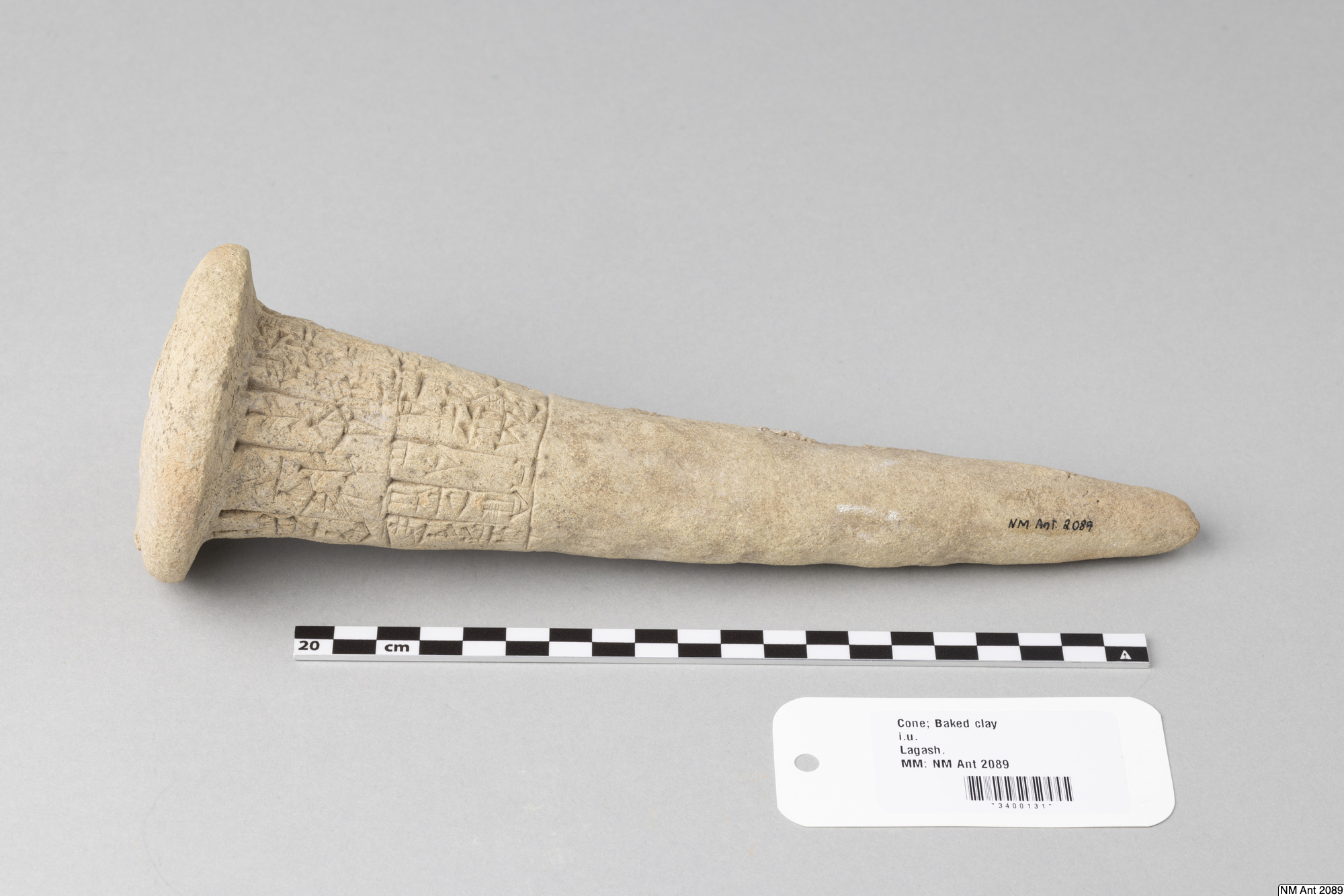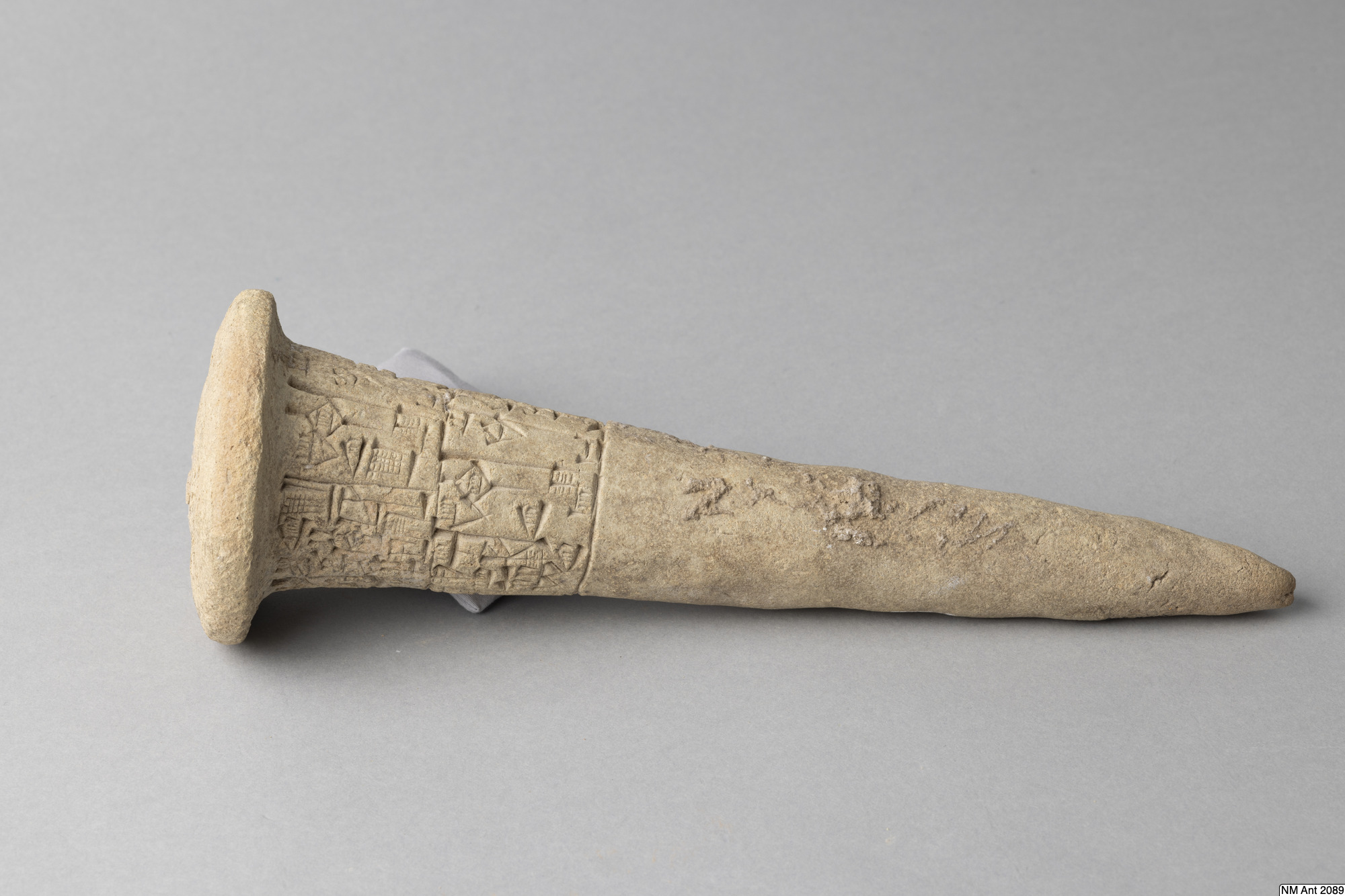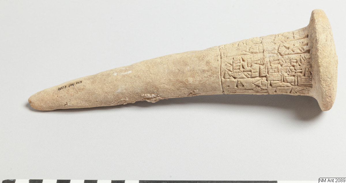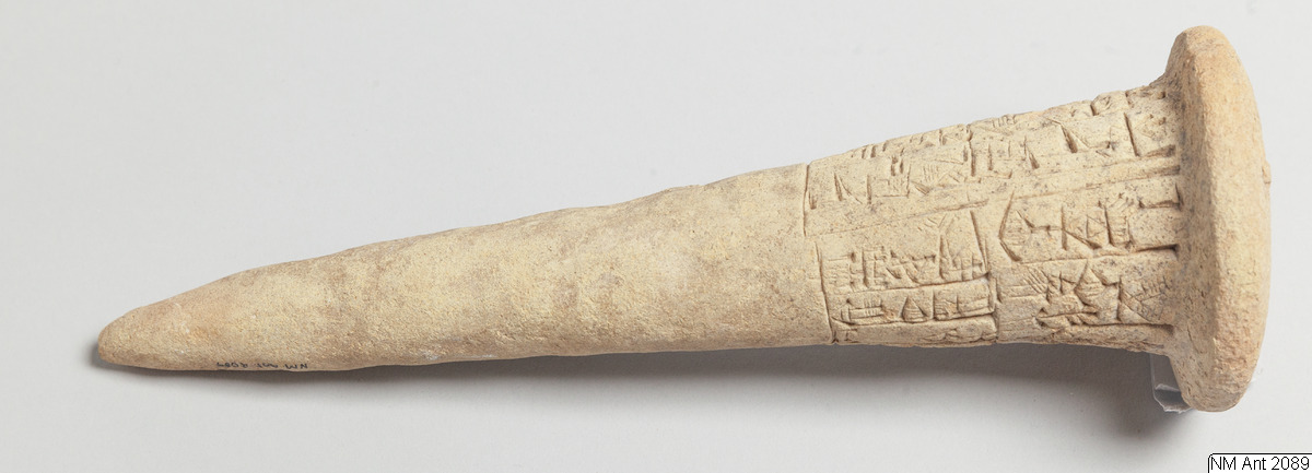 One of building cones from different temples at Girsu (Tello) with Sumerian inscriptions of the ruler Entemena. This and MM 1977:11 are inscribed with the same inscription (with minor variants noted in the transliteration below) of Entemena (also read Enmetena), who ruled the city-state Lagash c. 2450 BC. This city-state consisted of the main cities Lagash (Modern Al-Hiba) and Girsu (Modern Tello)...