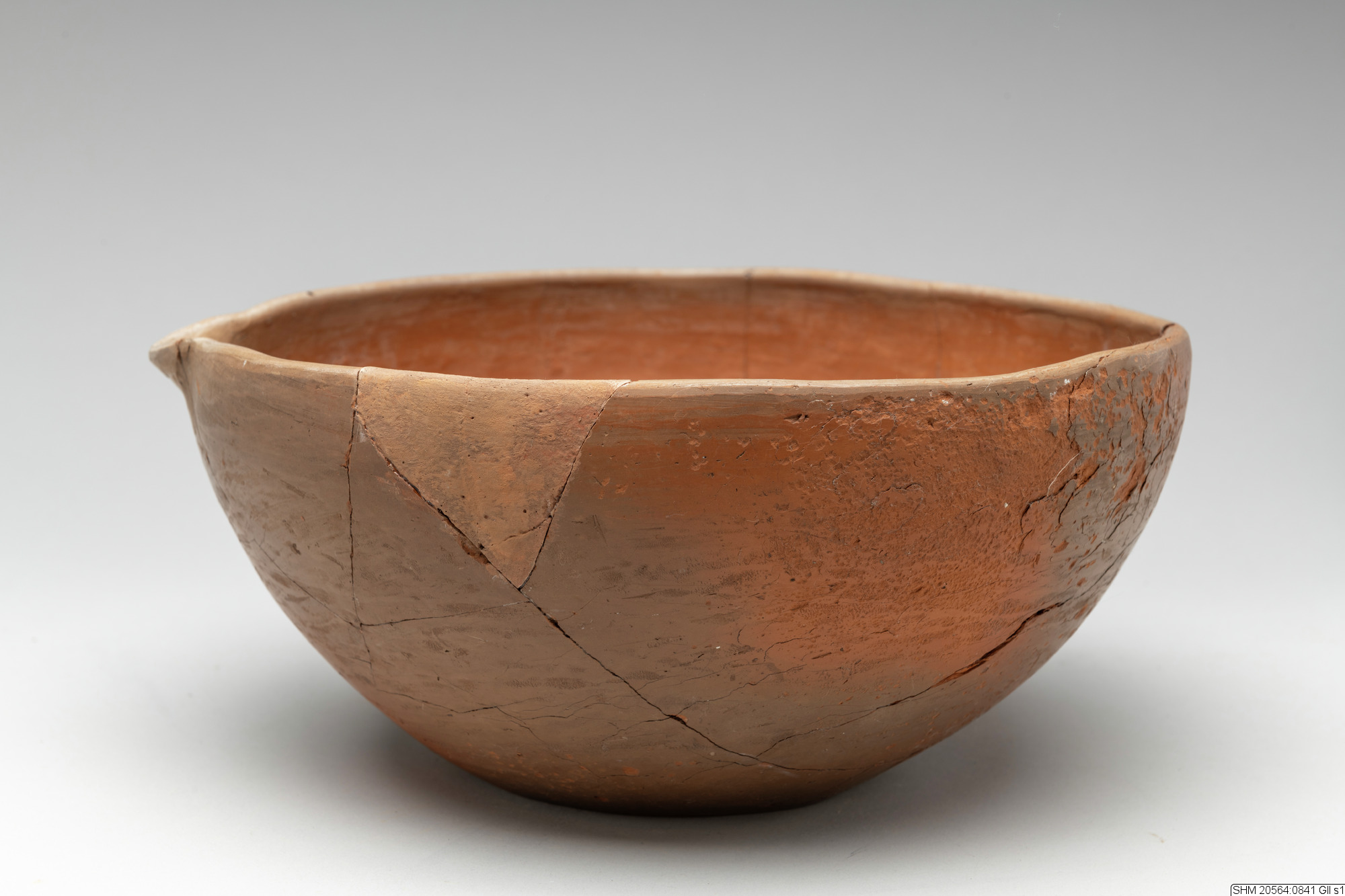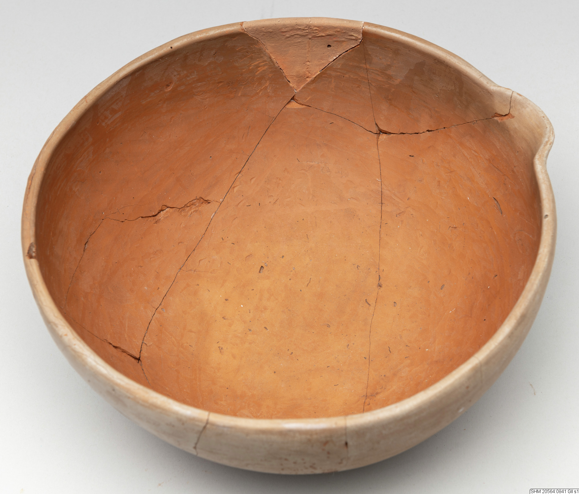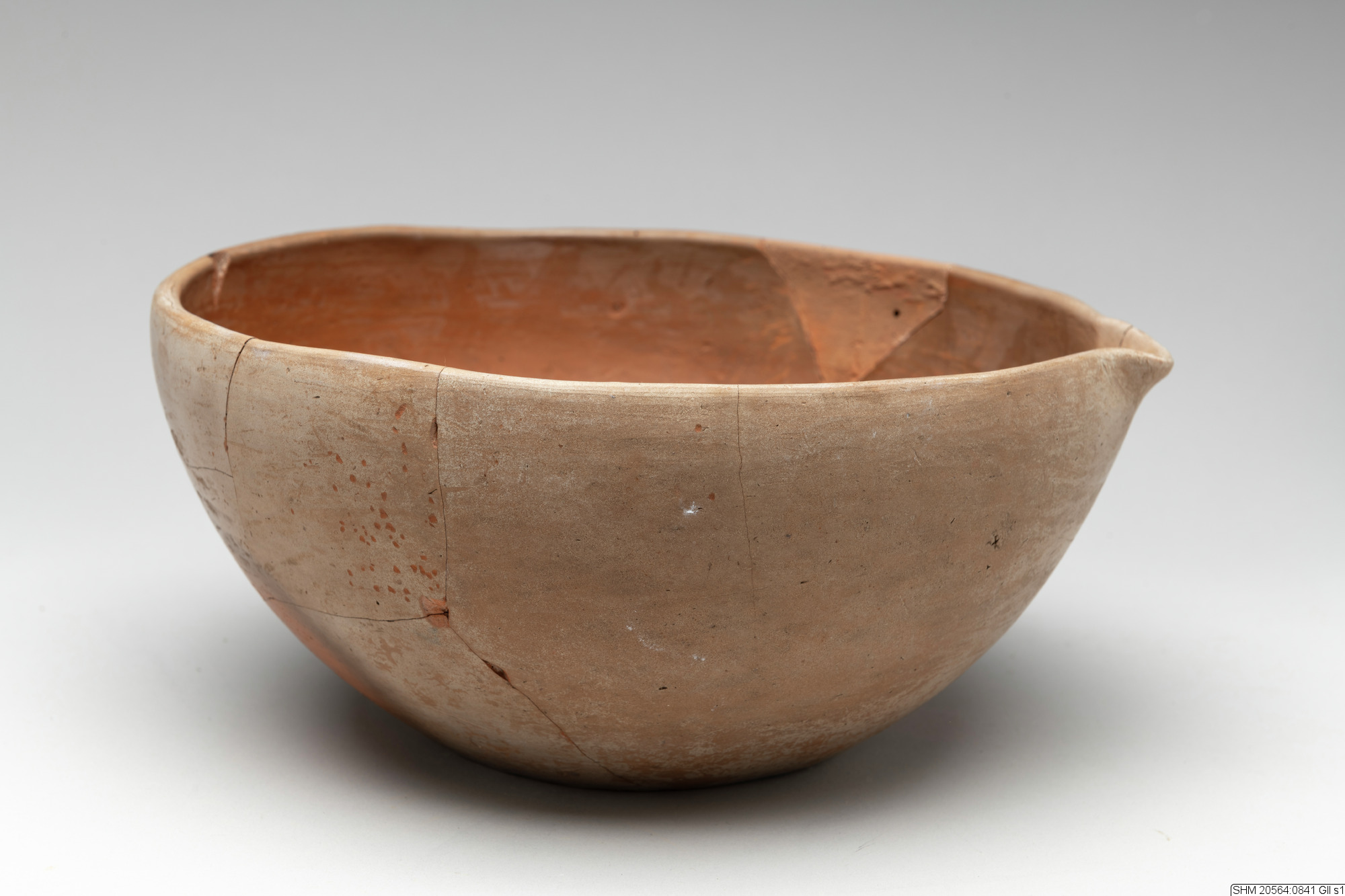 Red polished, wide, hemispherical, short-spouted bowl with flat base. The spout is very short and open.