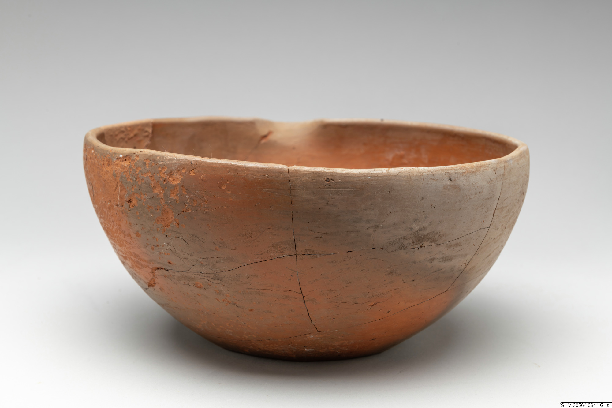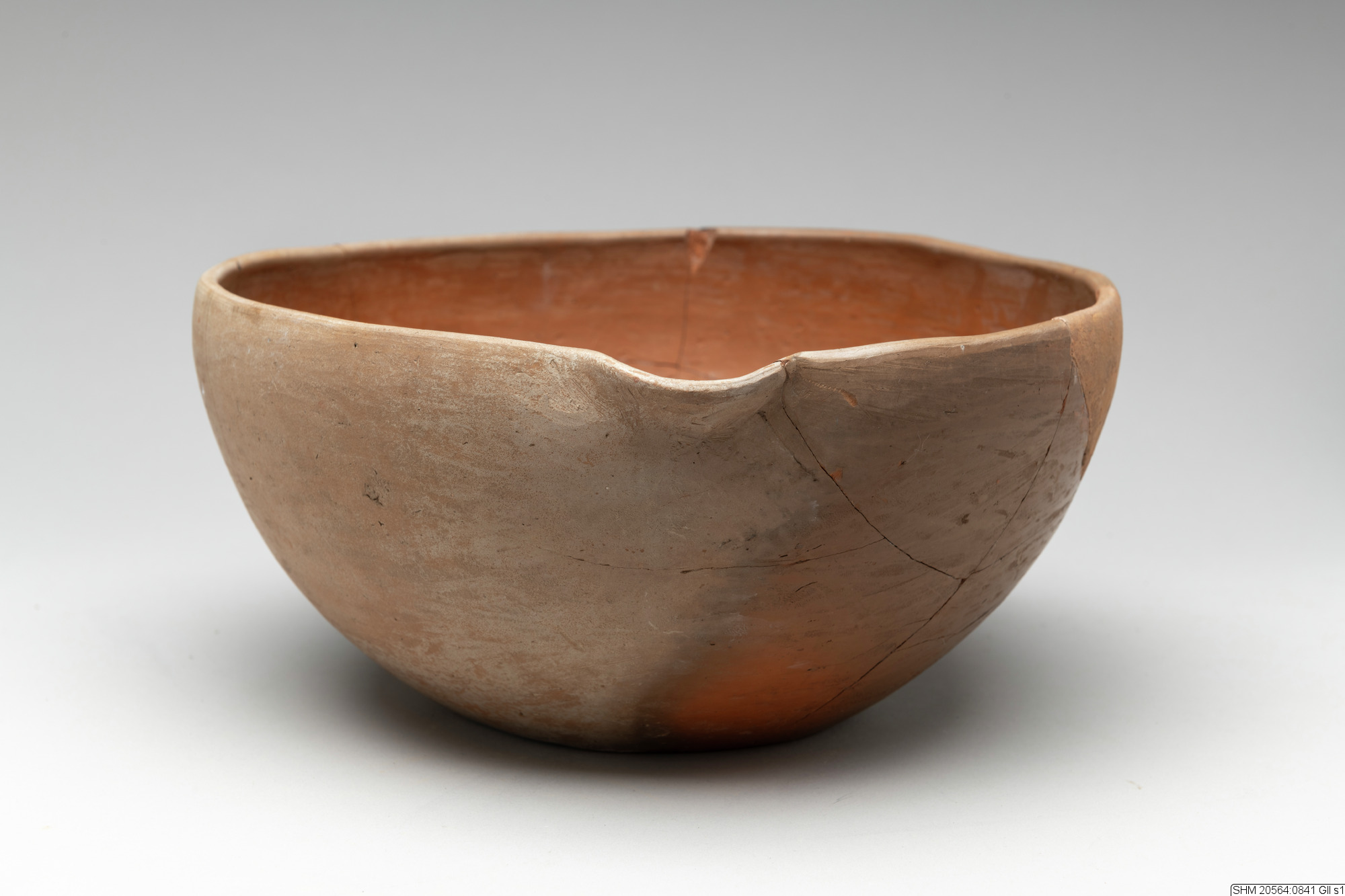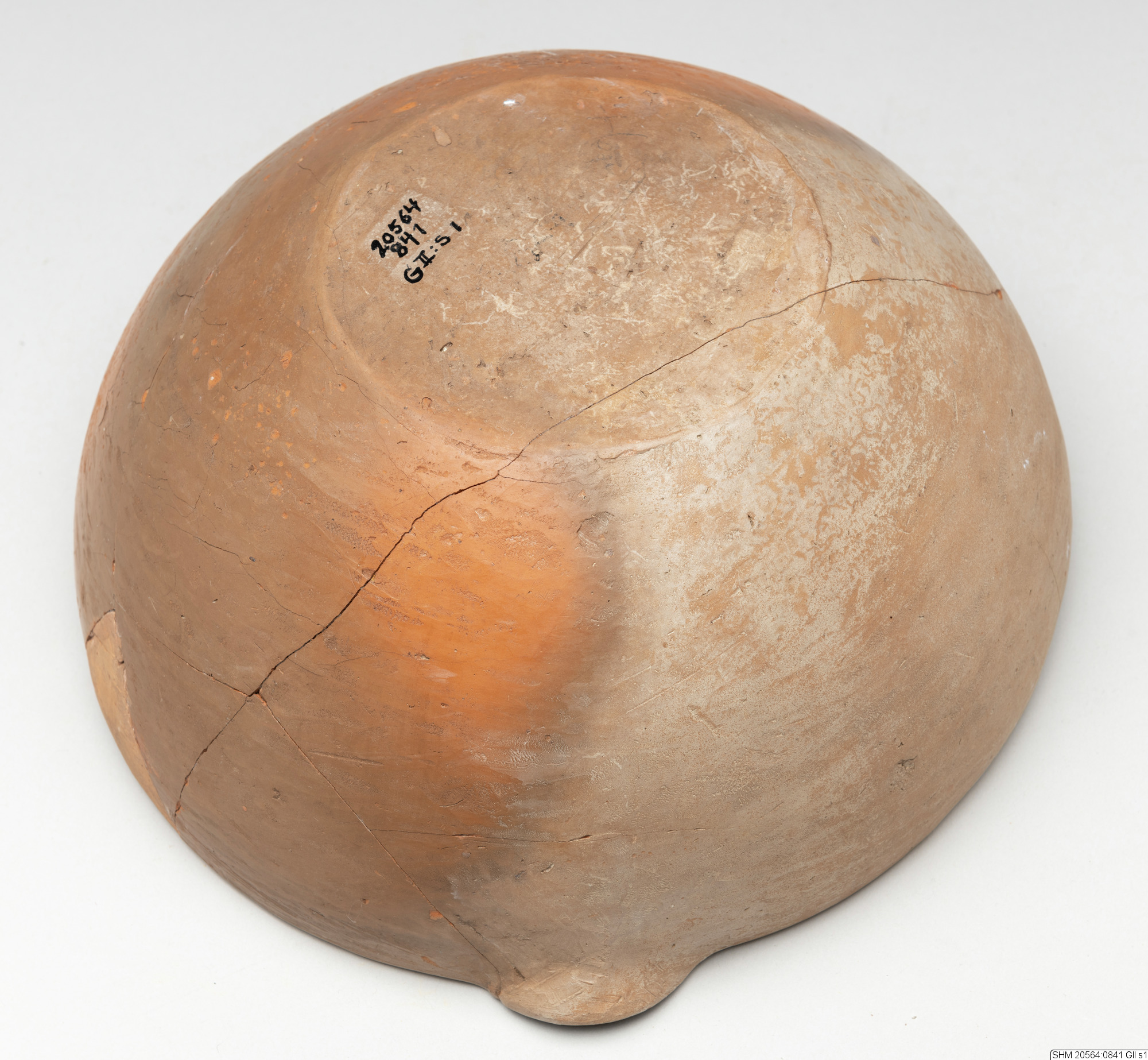 Red polished, wide, hemispherical, short-spouted bowl with flat base. The spout is very short and open.