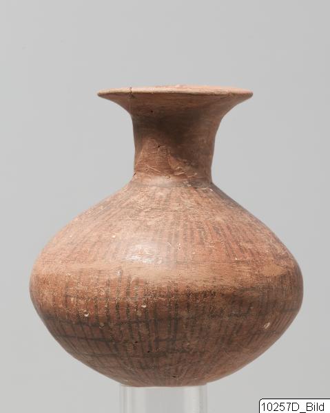 Black-on-red painted, squat bottle with narrow, flattened base, convexly curved body and high neck, slightly splayed with a wide, splayed, almost flat rim. The body is covered with narrow, vertical lines at equal distances, crossed by a few narrow, encircling lines. Inside the rim are three groups of vertical lines.