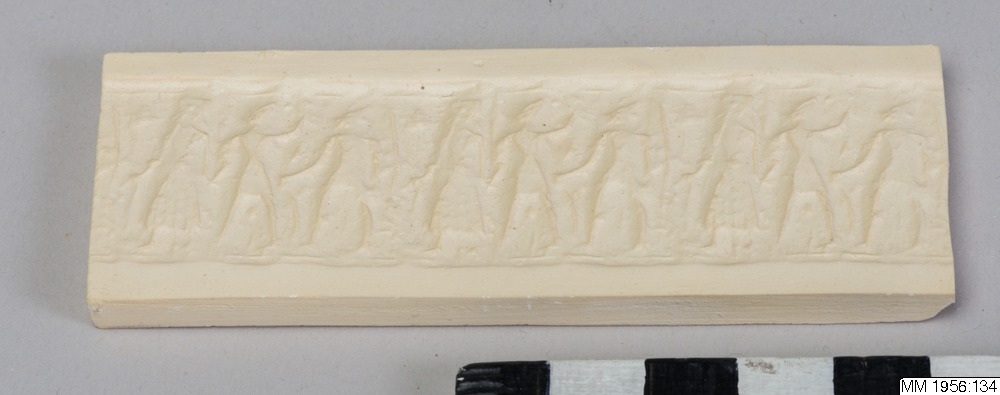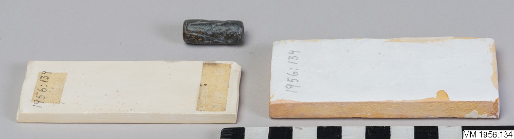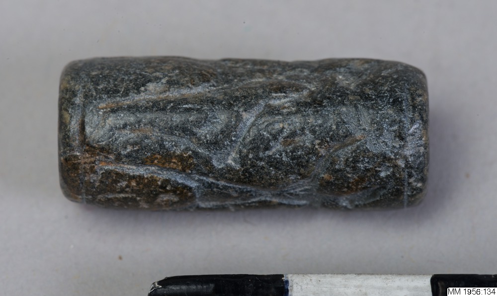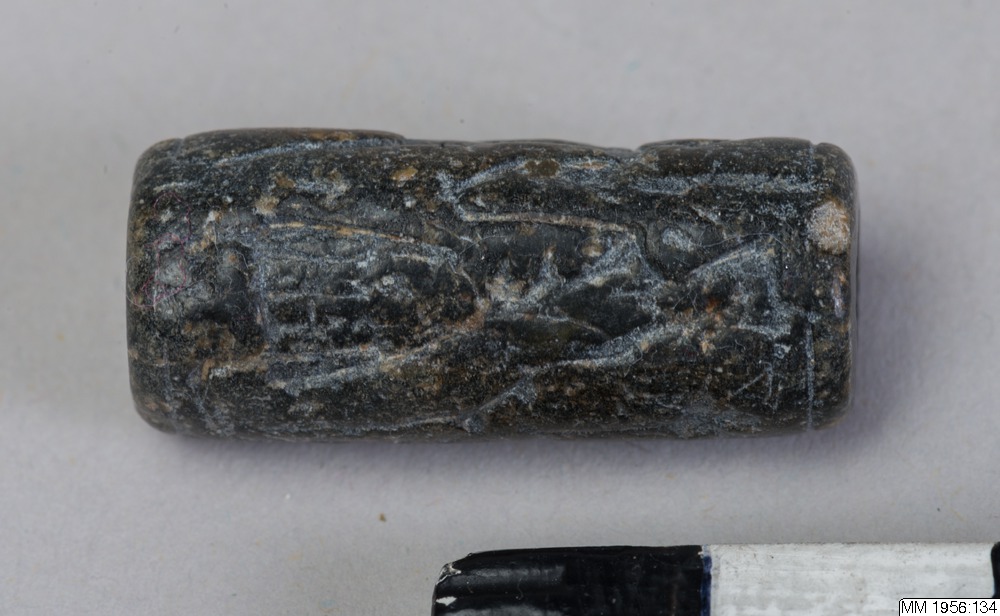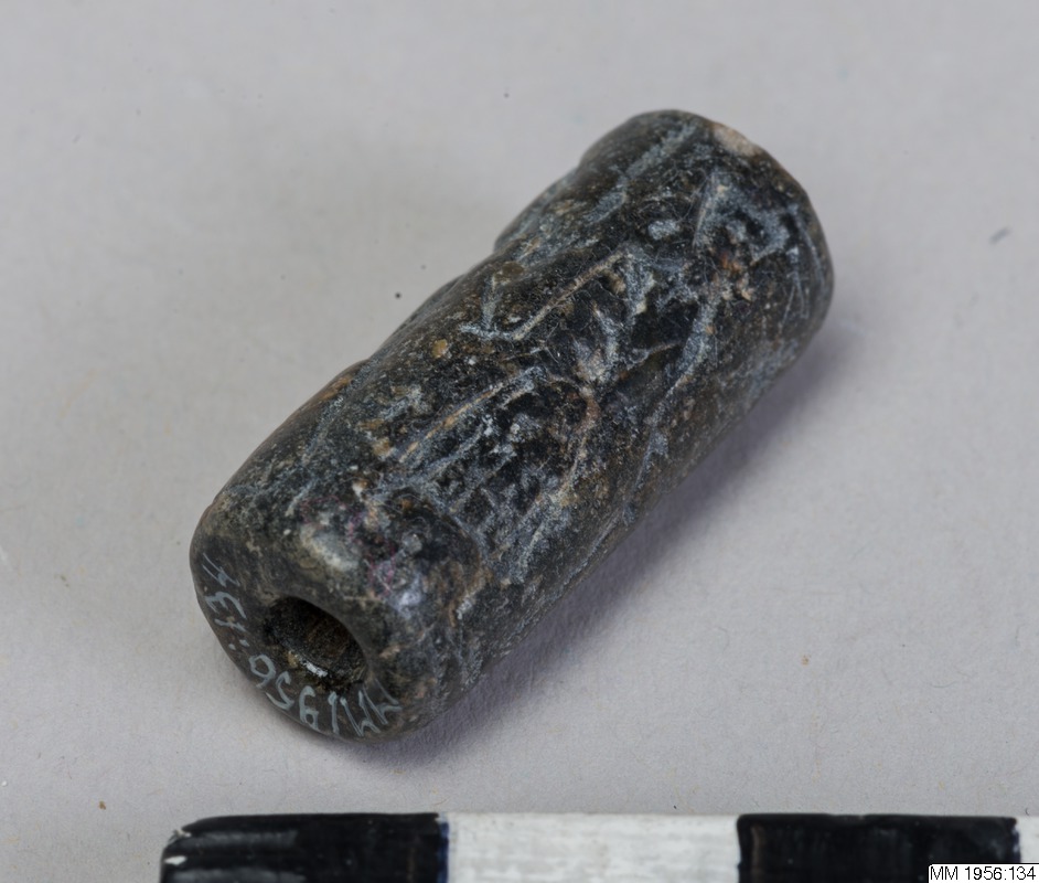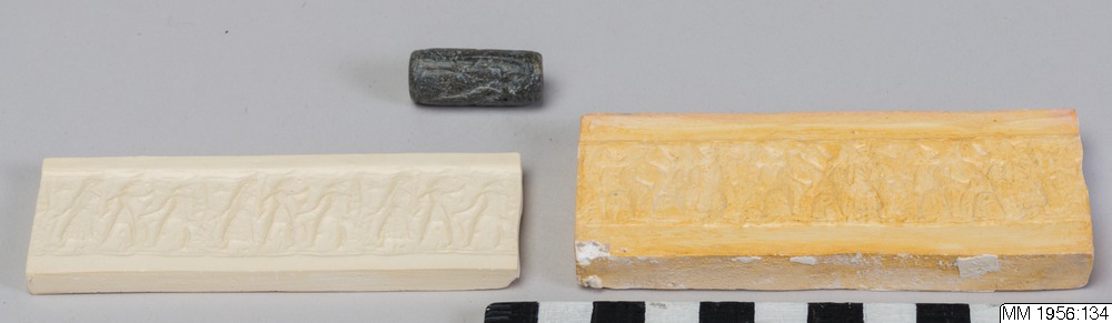 Cylinder seal with slightly offset, vertical bore. Engraving in low relief depicting three, standing, human figures, facing right. The first is wearing a long robe and a high, slightly conical headgear, and is playing a flute (?). The second figure, hand in hand with the first, has one arm raised, and is wearing a short skirt and a pointed headgear. The third figure, also wearing a short skirt and a pointed headgear, is holding a tall. bow-like object. Greyish-black serpentine.