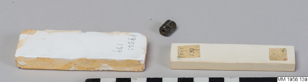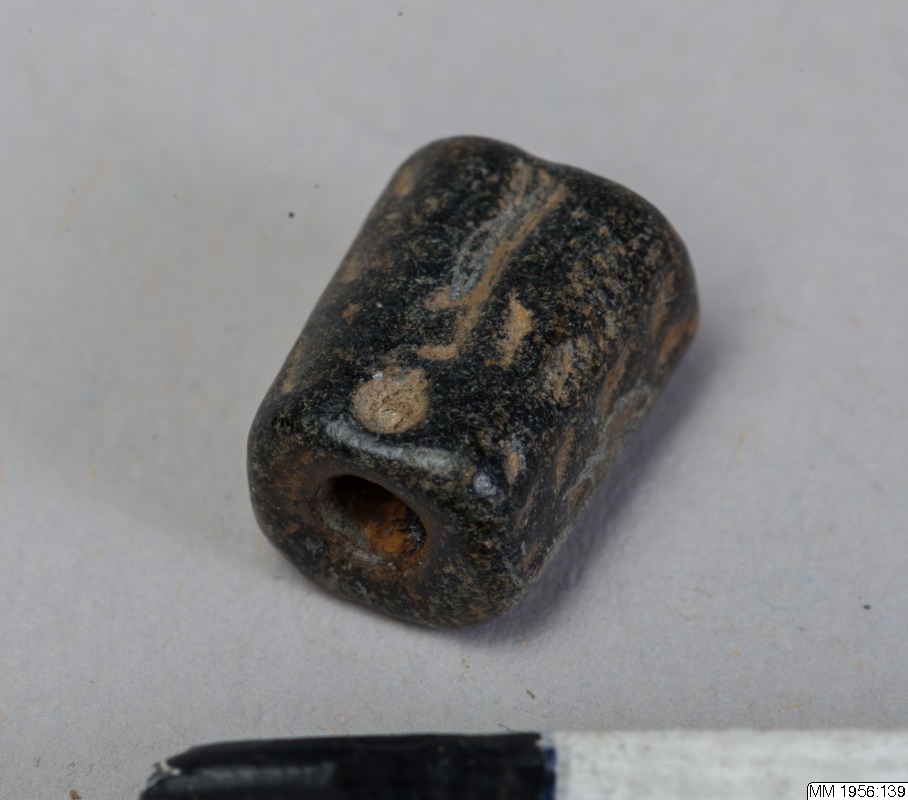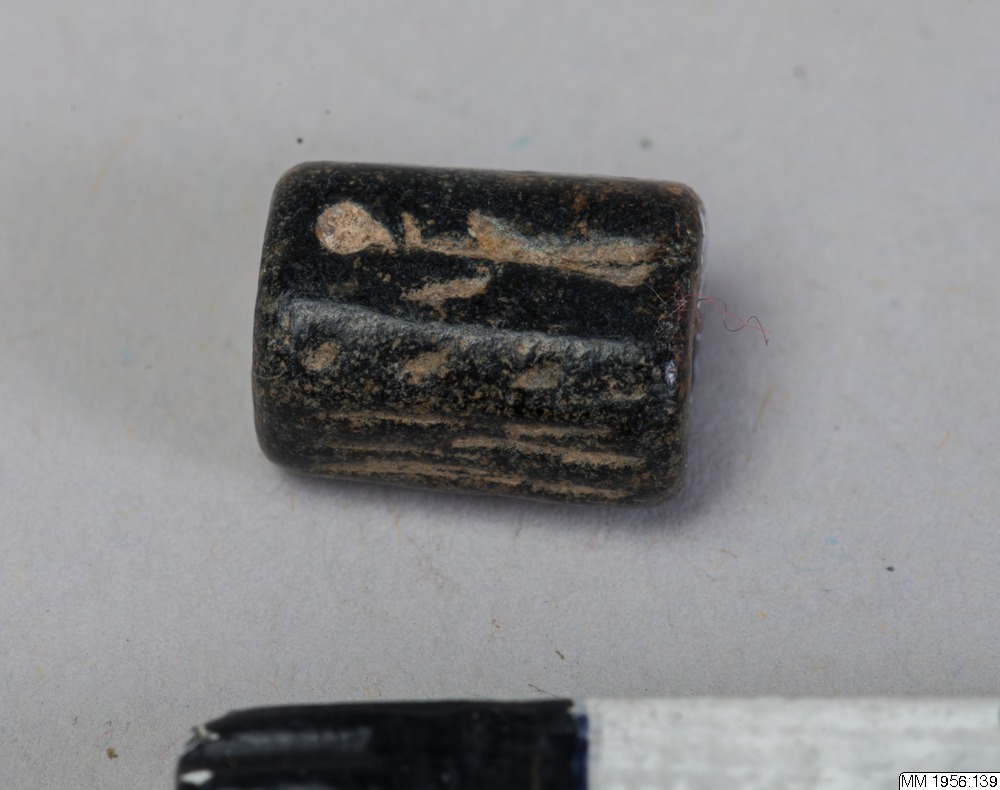 Four-sided seal with vertical, slightly offset, bore. Crude engraving in low relief. On one short side is a linear symbol (?), on the other short side are four rows of short, parallel, diagonal incisions. On each long side is a standing, human figure with raised arms, dressed in a long robe. Black, polished serpentine (?).