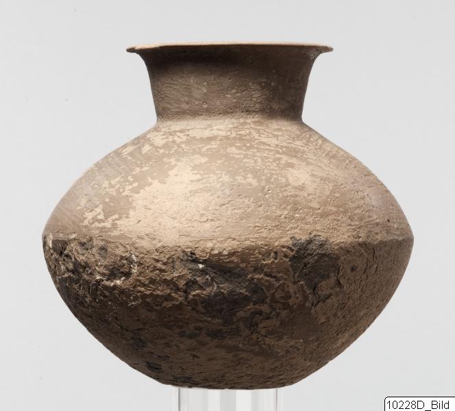 • Out-turned rim. Short, rather wide neck tapering downwards. Biconical body with marked belly-line. Flattened base. Light grey clay, darker grey polish.