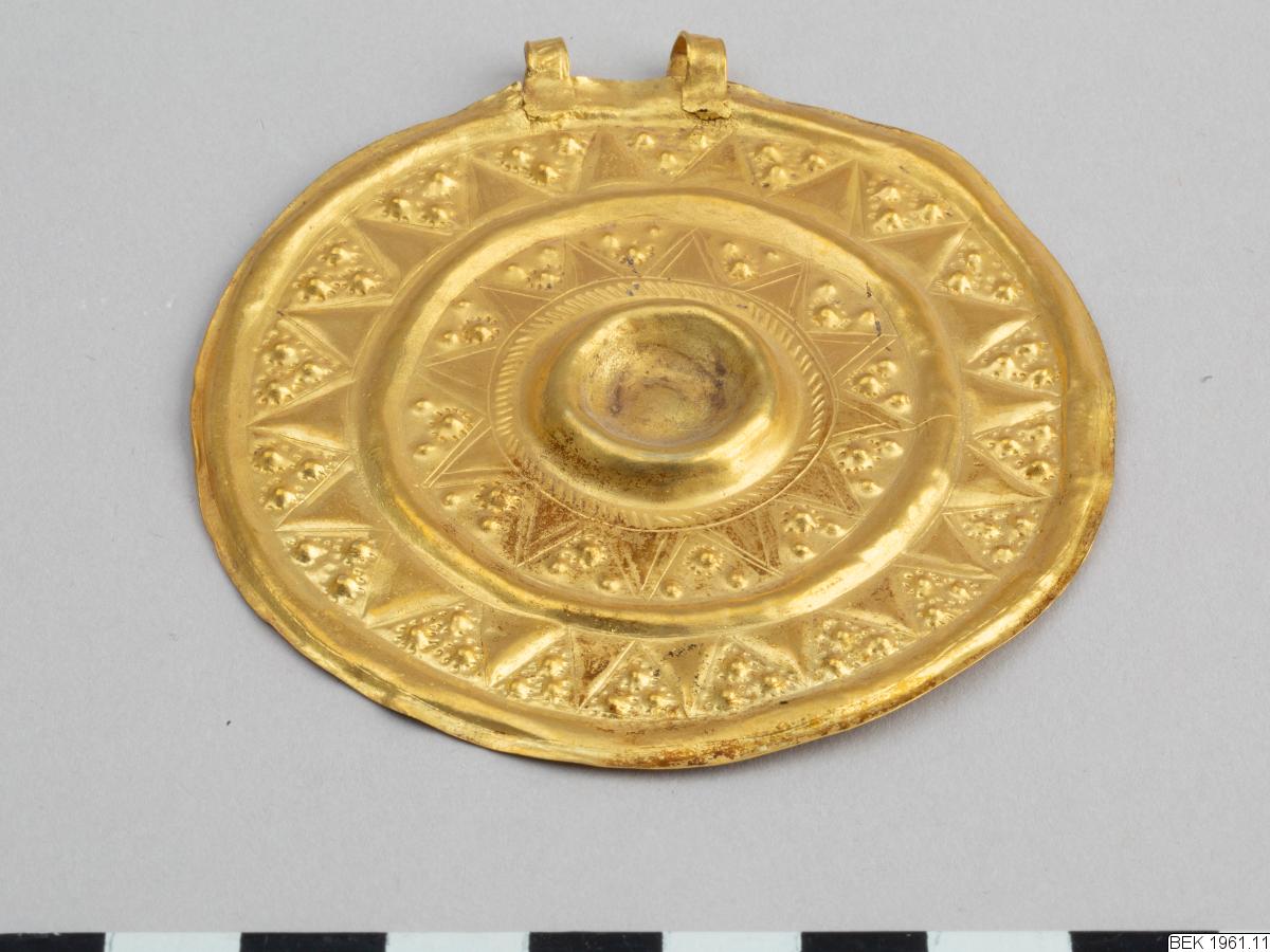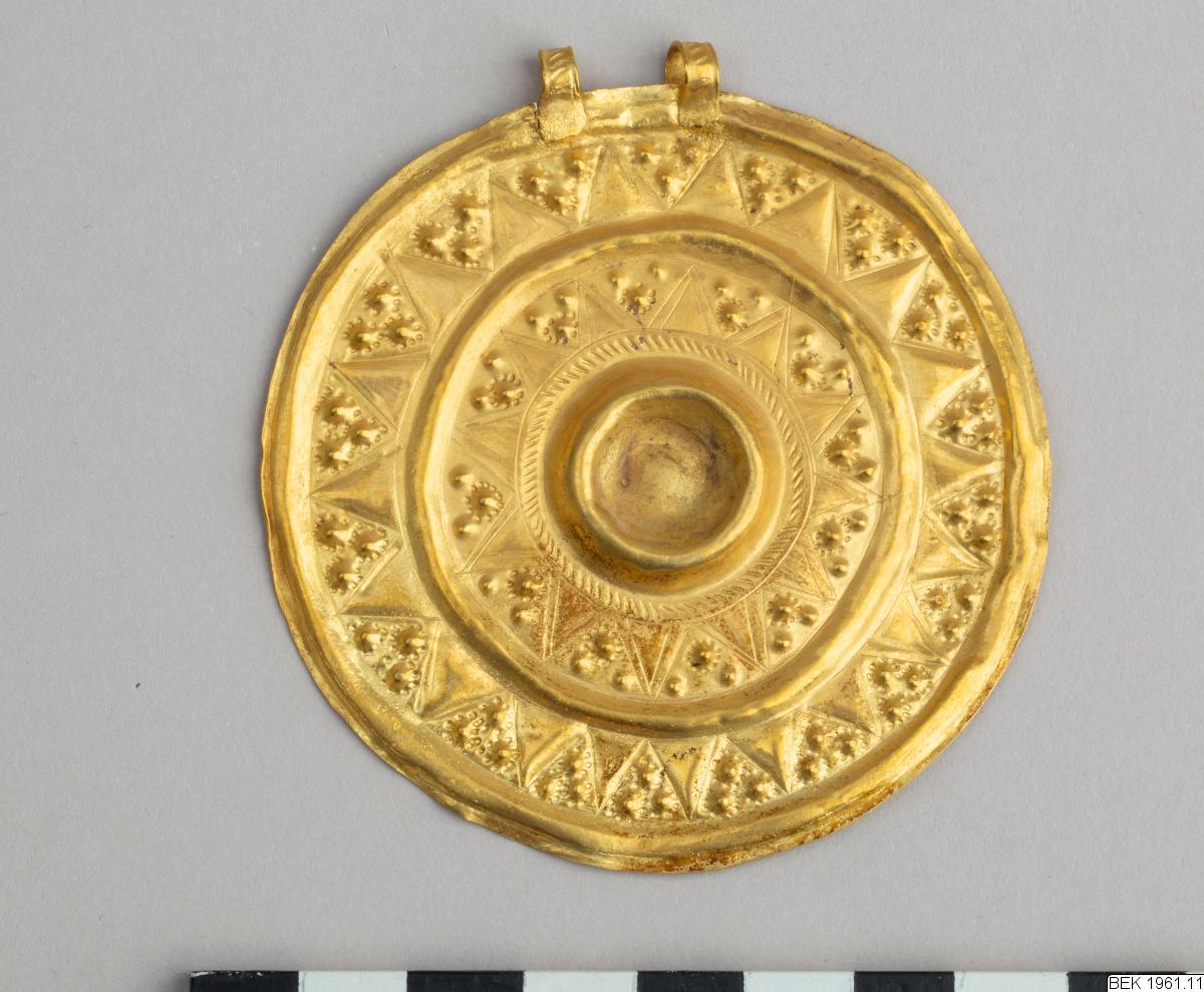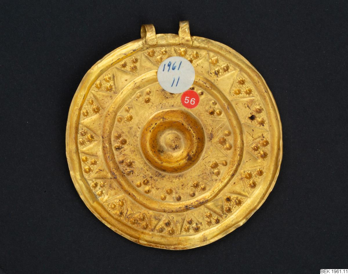 The pendant consists of a flat, circular disc. A double loop is soldered to the plate, decorated with a rope-pattern. The front side of the disc is decorated in relief ornaments. The decoration consists of triangles and dots in two concentric circles around a central hollow, which probably has been decorated with some precious stone. The hollow is encircled by a rope-pattern, similar to the patter...