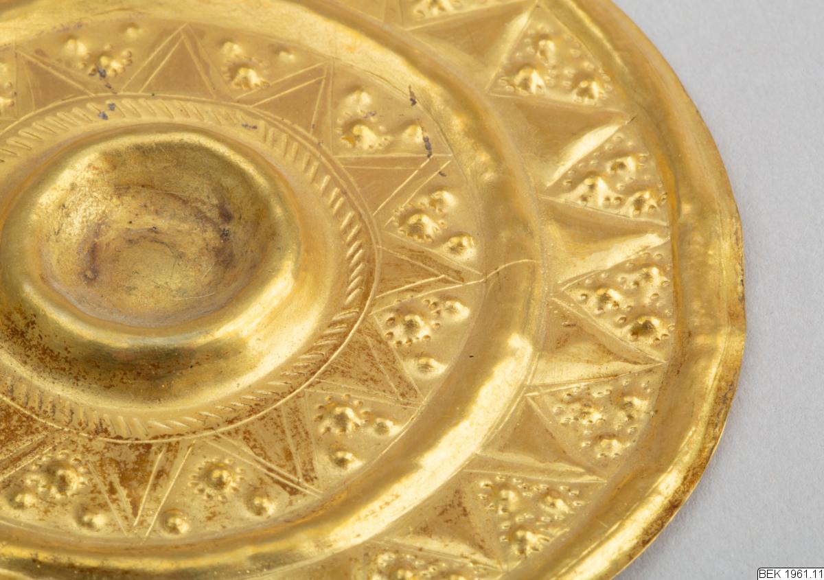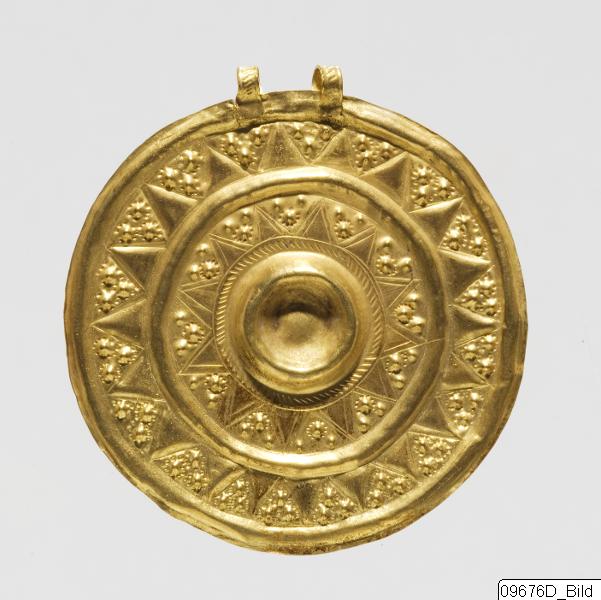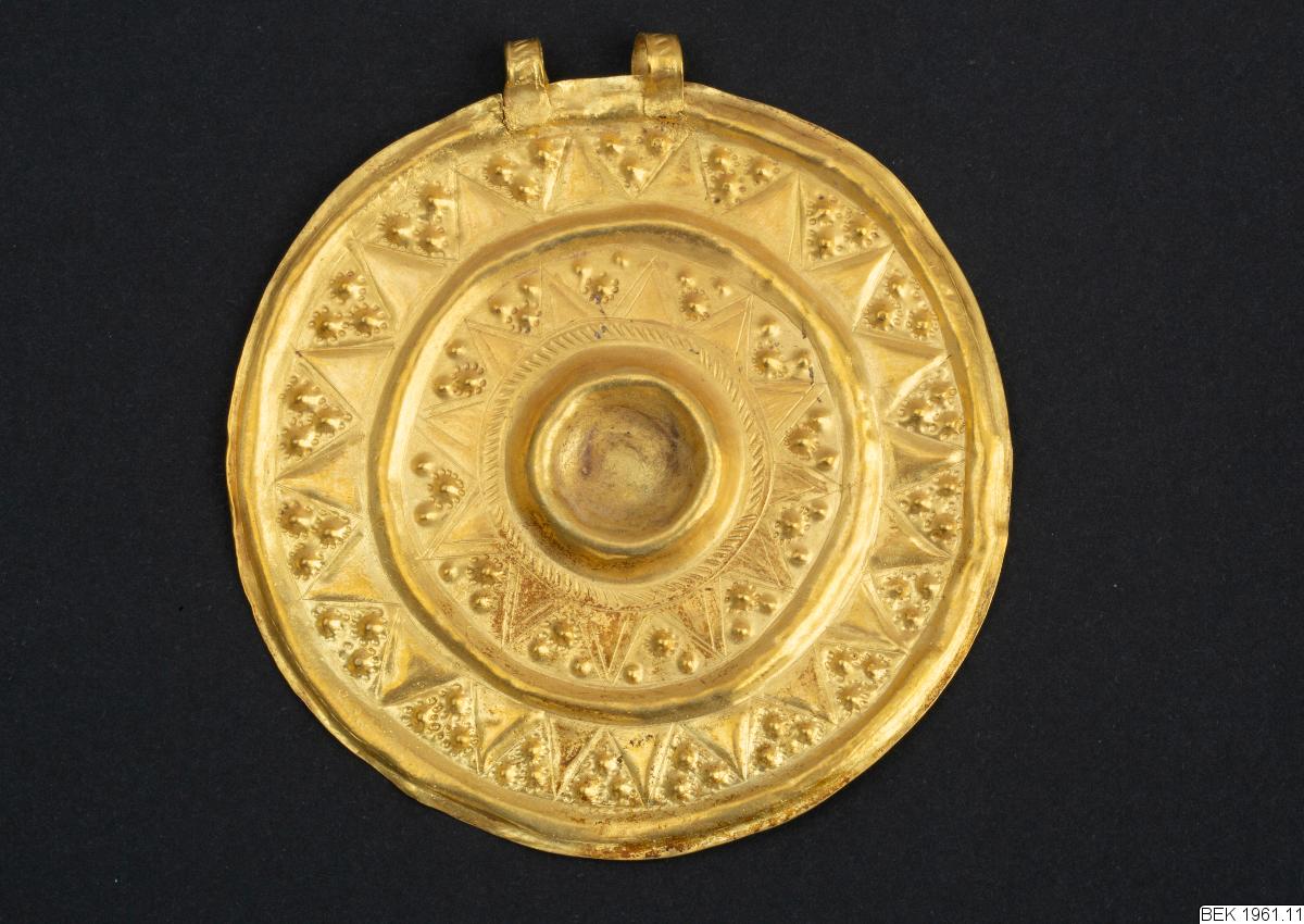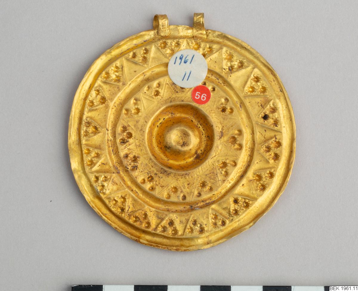 The pendant consists of a flat, circular disc. A double loop is soldered to the plate, decorated with a rope-pattern. The front side of the disc is decorated in relief ornaments. The decoration consists of triangles and dots in two concentric circles around a central hollow, which probably has been decorated with some precious stone. The hollow is encircled by a rope-pattern, similar to the patter...