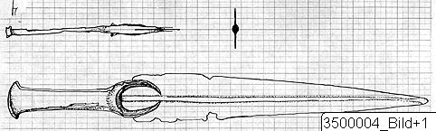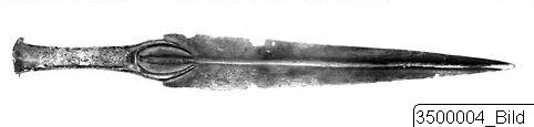 Cf/Excavated: Haerinck 1988 pl. 61: 13 p. Dailaman (Guilan) Iron Age I; Catling 1984 pl.195 (g) frag pommel w 6. Minoan. More cf in archives binder; Cf/Collection: Dyson 1964 fig 2: 5. Hilt: more flared pommel, rounded ricasso (etc.) blade shoulders slope more, edge incised herringbone framed fig 1:6 fragment, Philadelphia, Univ. Museum purchased, L: 15.3 pl. IX:4, UM58-3-2; pl. X Hasanlu bowl; Maxwell-Hyslop 1964, fig 1-10 different blade. Ours crescent hollow, this one solid cast on. L: 40 cm crescent, cast on (solid) see MMLur 5. pl.XII: 3; Childe 1969 fig 29 Gerzean dagger, copper & ivory hilt = Ur III from El Amrah like crescent ricasso, see also MMLur 5, 6, 8, 14; De Wulf 1968-69 type VB.