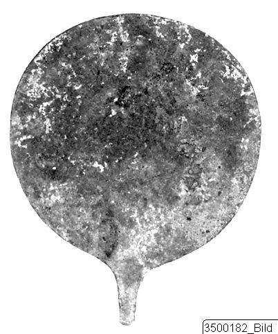 Cf/excavation: Schmidt 1937 Hissar III pl. LIV H4872, copper Ø 0,175 L: 0,25, same sloping necked tang; Schmidt et alii 1989 pl. 125a Do2 Ø 10, broad handle L: 5, Early Bronze Age A 21 A2.2. mirror f...