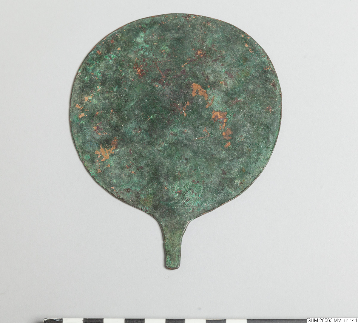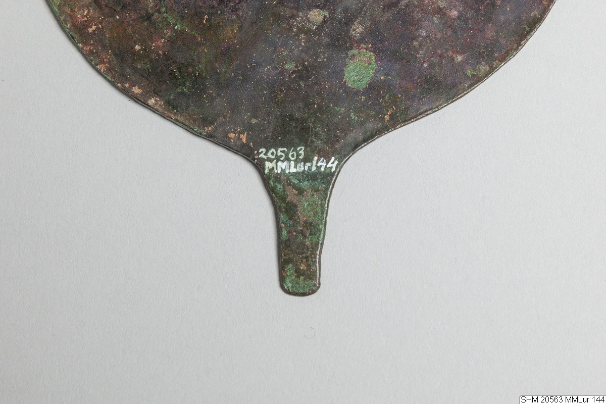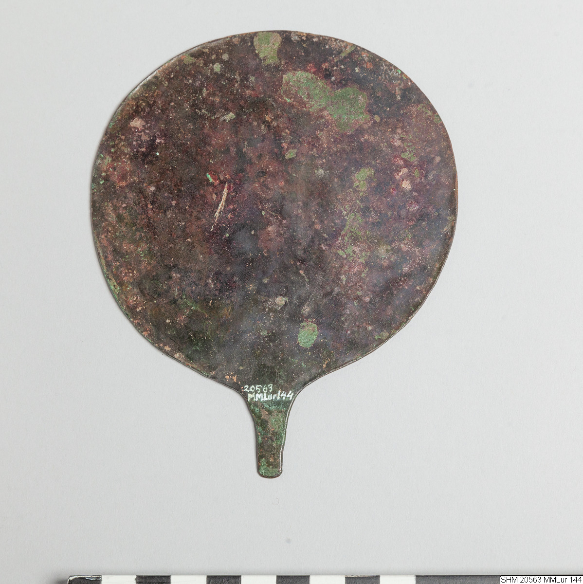 Cleaning and conservation report. D-nr 16455013, 950108. Condition: Surface is dirty with cement-hard deposits of soil, which form a distinct layer. Underneath there is smooth, dark green patina layer on one side of the mirror; this patina is missing in some spots, exposing metallic surface and very smooth dark brown patina layer. On the other side of the mirror there is very smooth, very dark brown with the black shine patina layer. There are smaller and larger slightly grainy, green corrosion spots, and few recent scratches in patina layer. Treatment: see 103: cleaned mechanically with scalpel, small soft rotating bristle and steel brushes, under magnification. Lightly waxed with bee's wax using small soft rotating bristle brush.