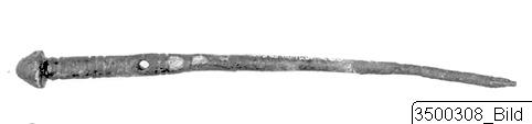 Cf/excavation: Vanden Berghe 1969a fig 95:12-15 heads, some with elaborate stems. Collective long grave Kalleh Nisar, Old Sumerian 2000-1700 BC. see MMLur258-60, 267; — 1968e p. 57 (2 in middle) heads possible decor? Lumpy necks Bani Surmah 2600-2500 BC L: 15 cm. See 258-261, 267; Schmidt et alii 1989 pl. 122i KII 257 L:18 Middle Bronze Age, very similar, ch. 21B.3.4 p.183 all bronze pins with domed or conical heads from Middle Bronze Age burials at Chiga Sabz and Kamtarlan II, elaborate engraved decor, can be later development from Early Bronze Age A Bani Surmah, some with holes "toggle pins" throughout NE since the third millenium BC, very numerous at Levant sites. pl. 165r Sor 1390 Iron Age, L: 21 more relief decor on top ch. 27D.9. p. 267 plain domed or conical heads bronze or iron, tradition back to third mill; Cf/collection: Moorey 1971 pl. 45: 265 (form); Contenau & Ghirshman 1935 pl. 15 level I, pl. 25 level II, pls. 26 -29, level III; Braidwood 1960 Antioch I fig 351:3 flatter heads, large hole two joined wires instead of drilled like ours, ca L: 13 Phase J.