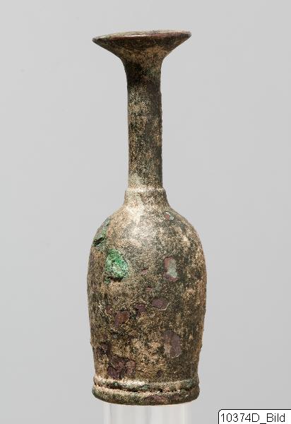Cast. Hollow cast, flanged top, tubular neck, bell shaped body, two base mouldings, one at neck. Upside down wine glass shape.
