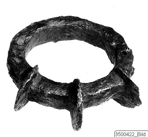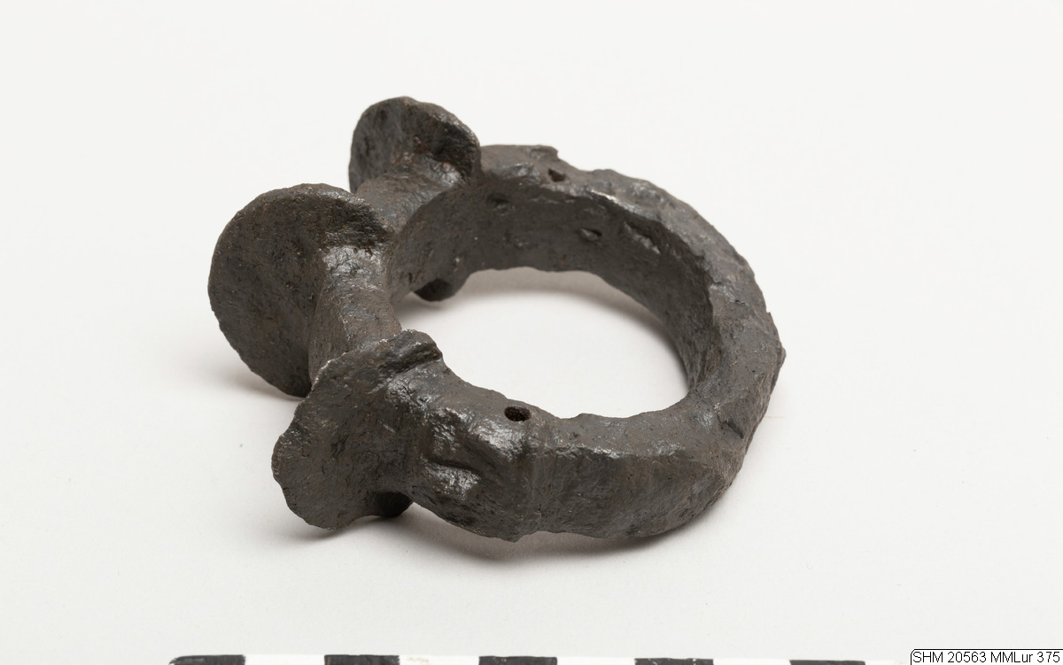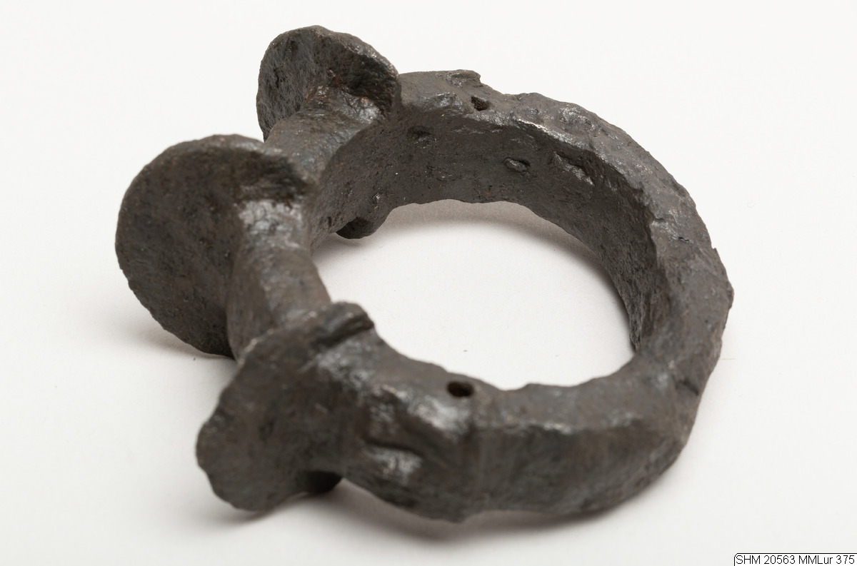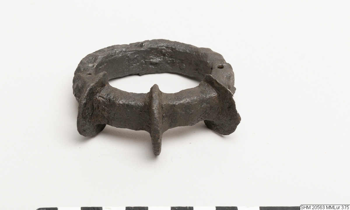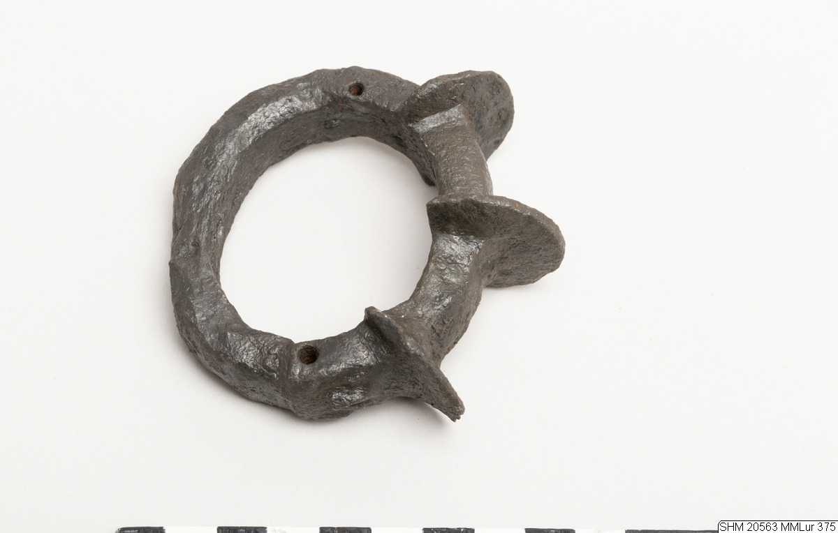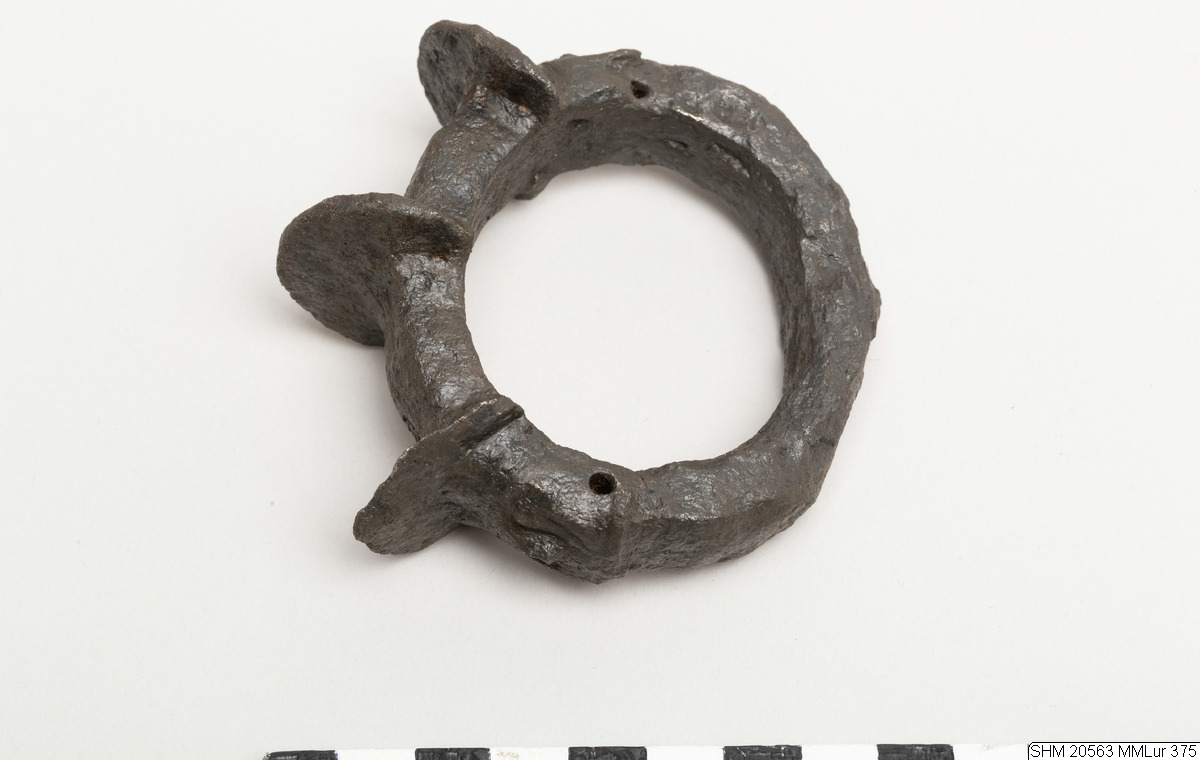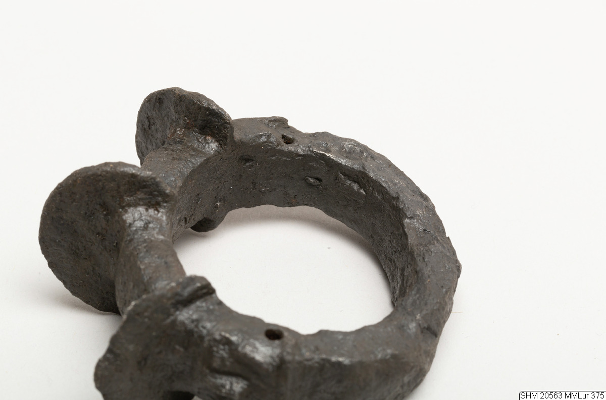 Oval iron ring. Quadrilateral section. On one side three projecting plates, semicircular in form. Rivet hole through band at side bottom of mask, joint visible at hole one side. Solid. Decor: below the projections: masks in relief and transverse holes.