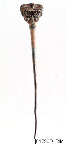Zoomorphically terminated pins are quite specific for Persia from the second millennium onwards. The lion head mask is the most typical Luristan type of all produced during the ninth to seventh centuries BC (Moorey). It appears on bracelets and axes and in pin form has been found stuck through an anthropomorphic tube mounted on a bottle shaped base (Godard). These straight pins were, however, more commonly used in pairs at the shoulders of garments (Porada).