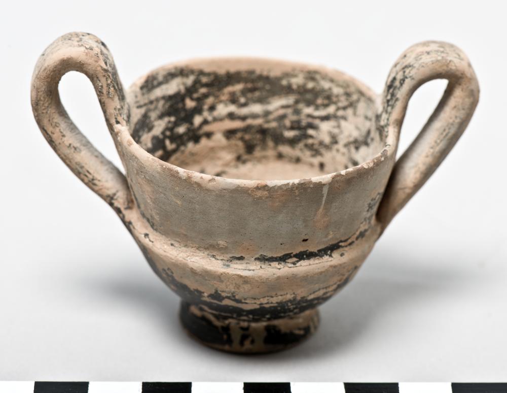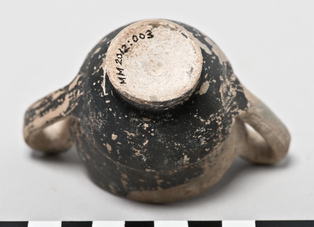 • Black-glaze miniature kantharos of South Italian manufacture. Glazed in and out, but glaze poorly preserved. The vessel is intact.
