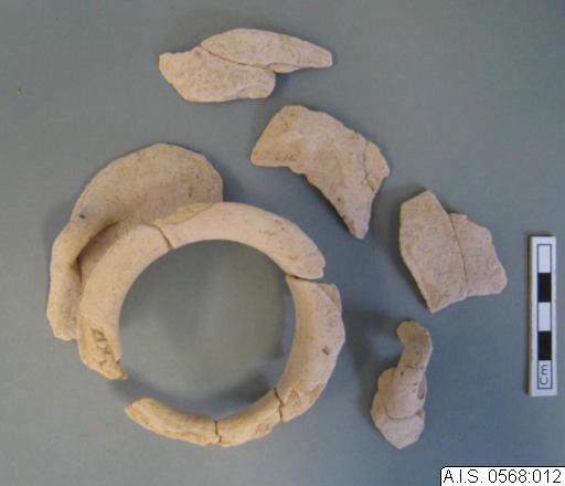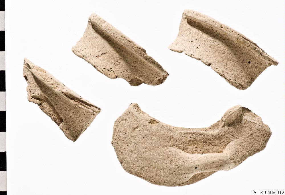 Merparten av mynningen och halsen med ett litet skulderparti och ett av handtagen. Ytterligare skulderskärvor och ett handtag finns, men saknar passningar sinsemellan. Godset är mycket hårt vittrat; d...