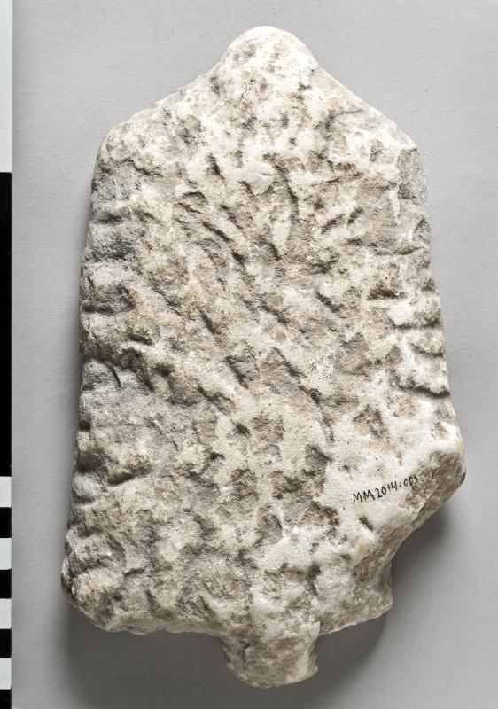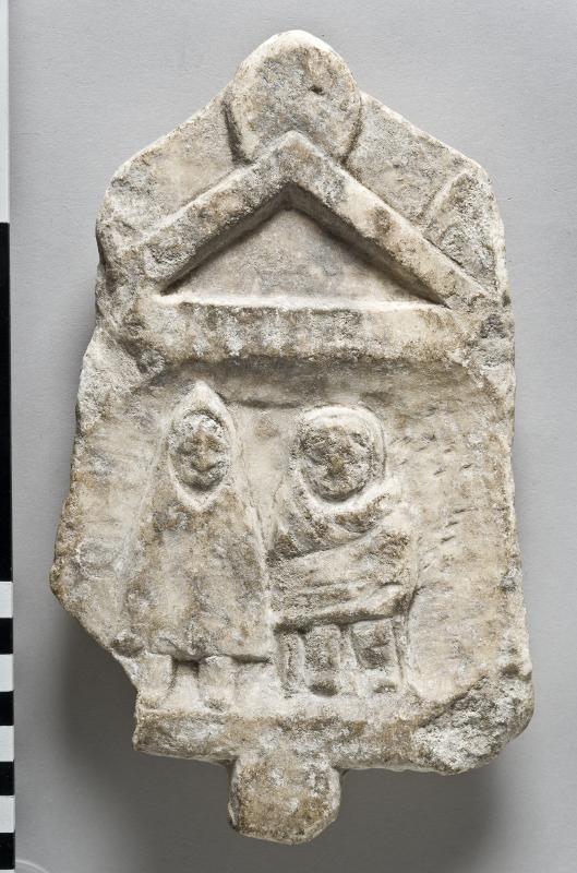 The image is framed by a rectangular plinth and a pediment. There are no pillasters or capitals. The pediment is crowned by two remaining akroteria, the third is missing. The akroteria are plain although they are shaped as palmettes. Faint traces of red paint are visible on the pediment. The back of the stele is roughly hewn Two figures are shown in frontal view presumably depicting a man and a woman. The couple is both draped in garments with raised hoods framing the faces. The slightly taller figure to the left has a conical silhouette and carries a long cloak, worn with hood pulled up around the exposed face. The rest of the body is covered as far as the ankles. The garment is probably a peasant’s cloak. Facial features, like eyes and nose are hinted vaguely. The figure to the right is rectangular in stature with a round face; headgear or possibly hair is hinted bellow the hood. Two garments are hinted, the dress (himation?) ends just below the knee while the cloak ends at the feet. One side of the cloak is casually draped over the figure's left shoulder. The garment might depict an arm sling. Facial features, like eyes and nose are hinted vaguely.
