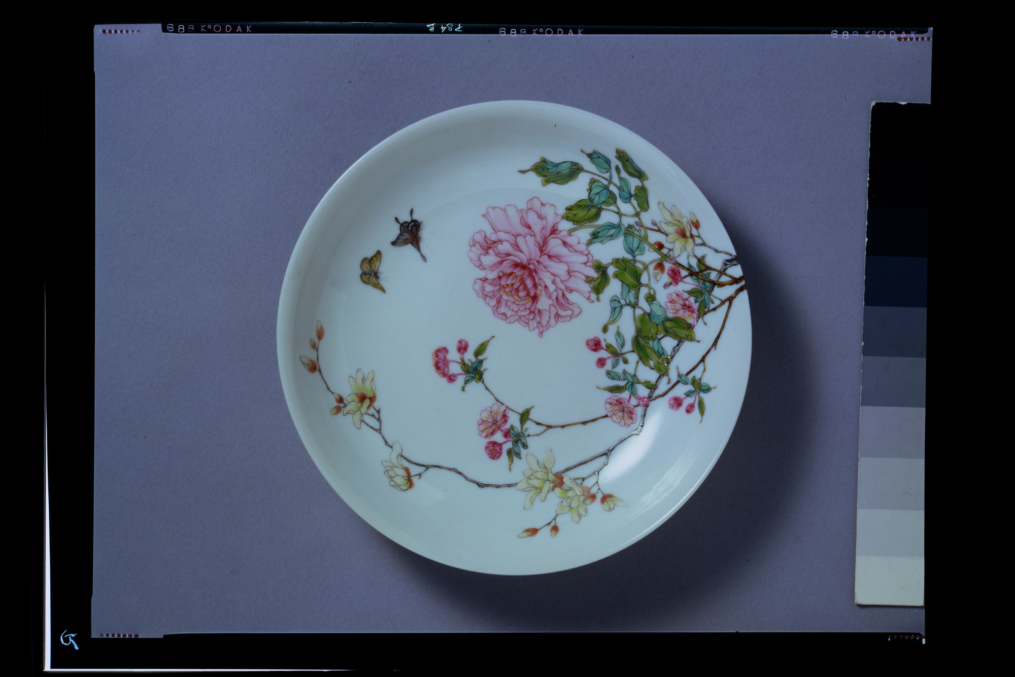 Text på plastficka: OM 1977:138. Fat av porslin med dekor i famille rose-emaljer. Kina, qing-jun. Youngzheng-perioden. 1723-35. Fotograf. Erik Cornerlius. Östasiatiska Museet. Text på huvudkuvert: OM 1977/138. Kina. Famille Rose, 1725 ca. Qing-dynastin, youngzheng-perioden 1723-35. Retur: Östasiatiska Museet. Box 16381. 103 27 Stockholm. Beskärs 2 cm upptill och nedtill. Förstors 16,5 cm Frilägg Ej!!.