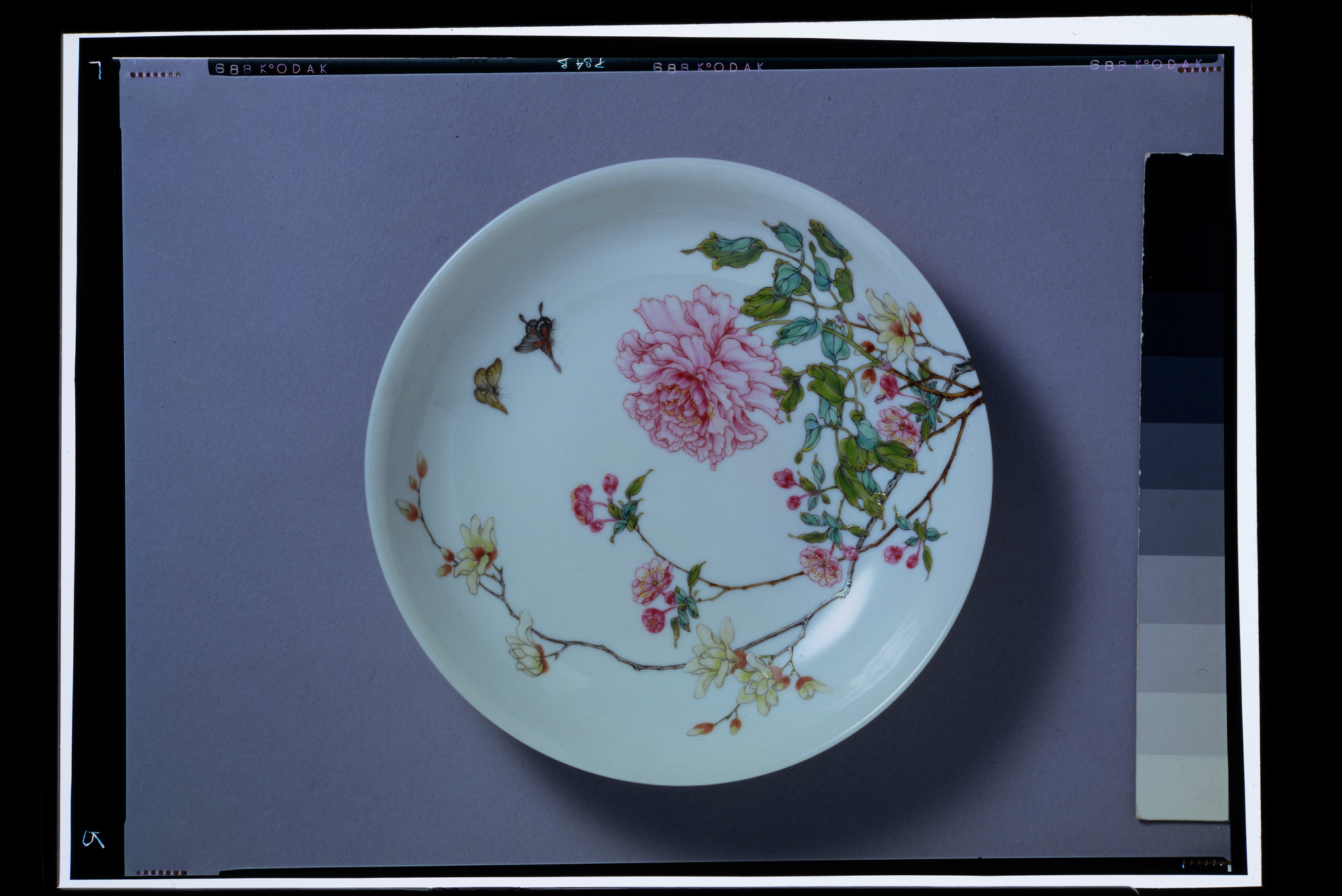 Text på plastficka: OM 1977:138. Fat av porslin med dekor i famille rose-emaljer. Kina, qing-jun. Youngzheng-perioden. 1723-35. Fotograf. Erik Cornerlius. Östasiatiska Museet. Text på huvudkuvert: OM 1977/138. Kina. Famille Rose, 1725 ca. Qing-dynastin, youngzheng-perioden 1723-35. Retur: Östasiatiska Museet. Box 16381. 103 27 Stockholm. Beskärs 2 cm upptill och nedtill. Förstors 16,5 cm Frilägg ...