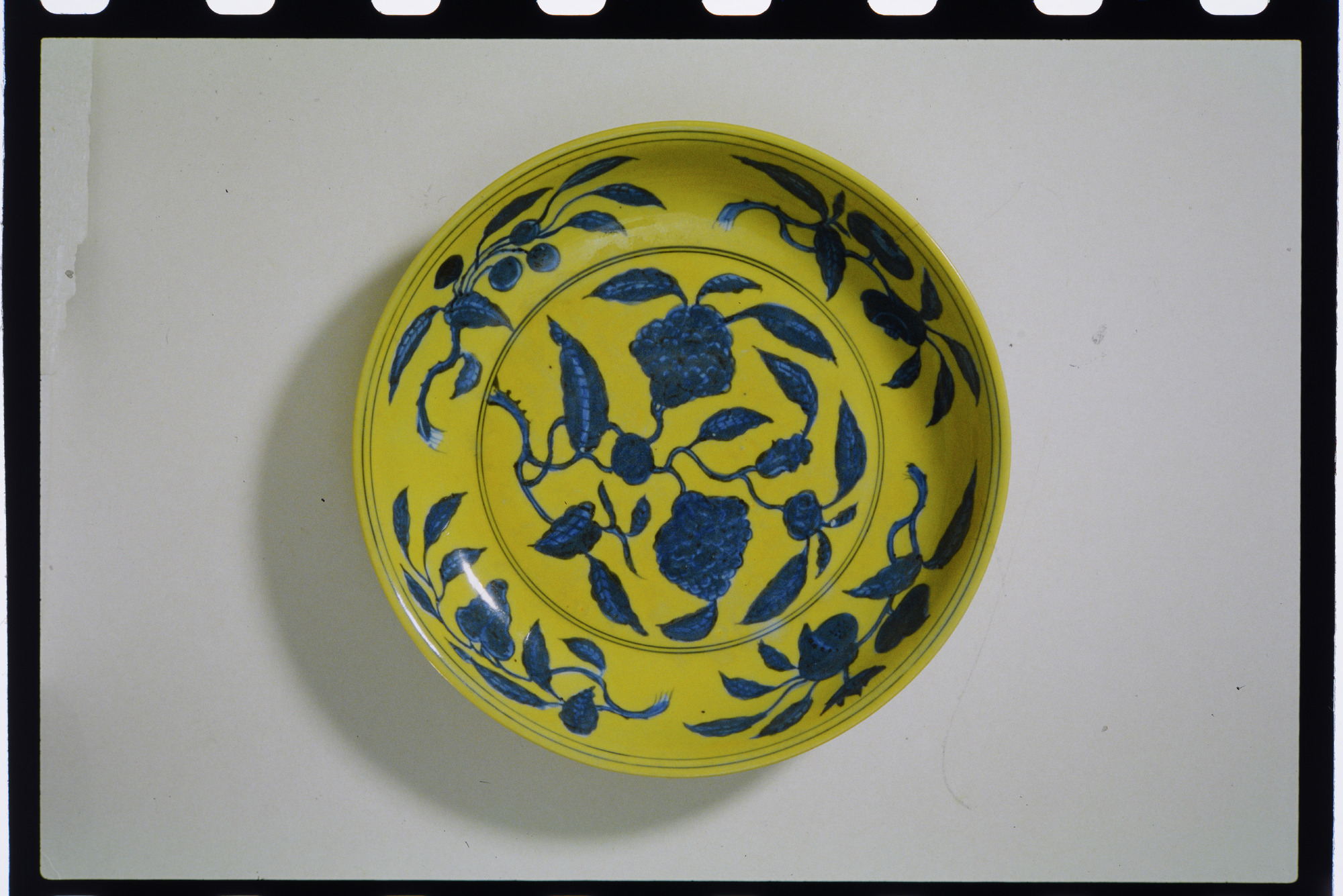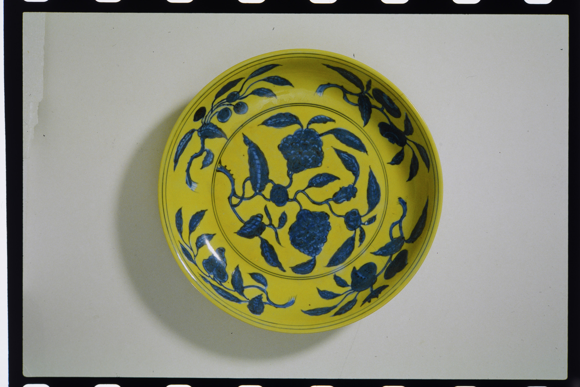 Text på plastficka: DYRGRIPAR FRÅN KINA OCH JAPAN. En samlares gåva. 12/9 - 15/11 1992. Fat av porslin med blomdekor i under-glasyrblått mot gul fond. Kina. Märke och tid Zhengde (1506-21). Ming-dynsatin. 13.6/43. RETUR: Östasiatiska Museet. Box 16381, 103 27 STOCKHOLM.. Text på huvudkuvert: OM 18/1991. Färg. Kina. Fat av poslin. Ming.