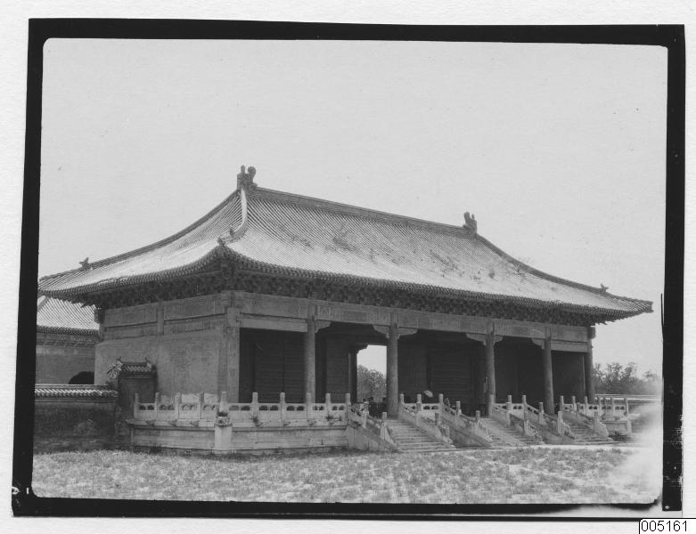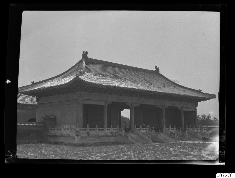 • Byggnad i form av en port. Troligen i Tiantanparken. En stenlagd gångväg leder fram till och igenom porten.