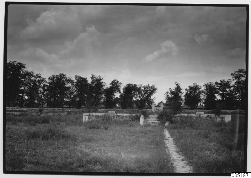 • Stenbelagd gångväg som leder upp till en altarliknande plattform. I bakgrunden en rundad mur. Allt nästan övervuxet av gräs och sly.