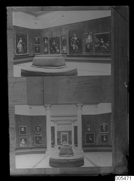 • Två utställningshallar med porträttmålningar. En rund fåtölj-soffa i mitten av rummet.