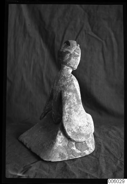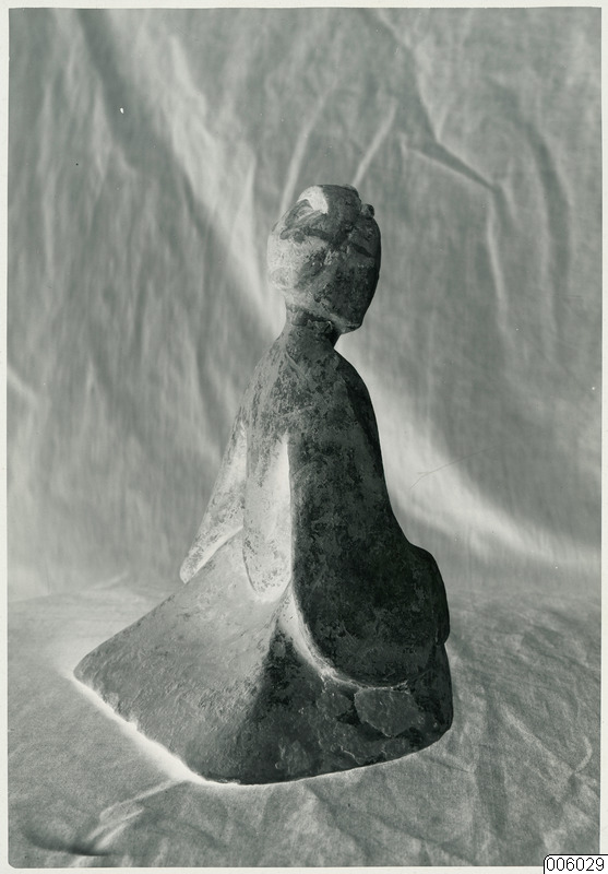 • Skulptur gestaltande sittande kvinnlig figur sedd från sidan.