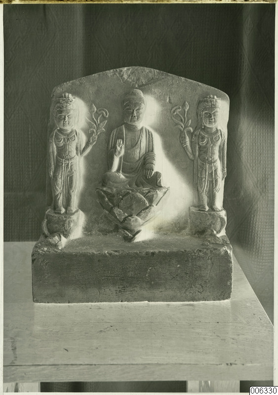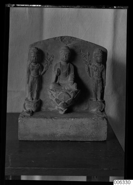 • Stele med sittande Buddha flankerad av två stående Bodhisattvor.