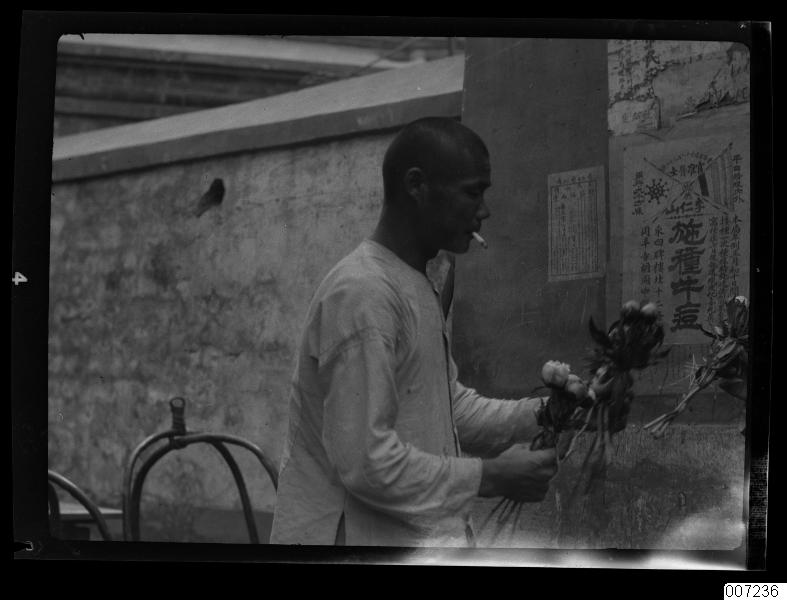 • En man med blombuketter i handen. Det ser ut att vara pioner. Mannen har en cigarettstump i mungipan.