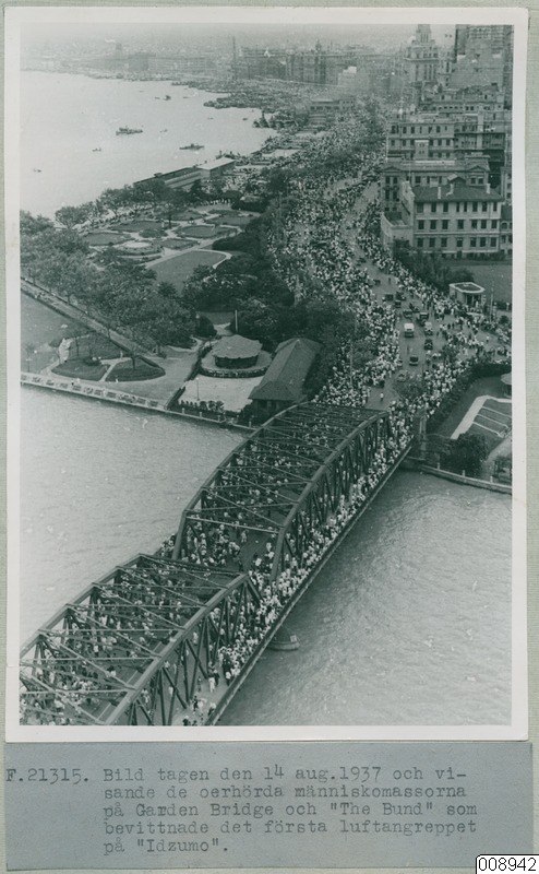 Bild tagen den 14 augusti 1937 och visande de oerhörda människomassorna på Garden Bridge och "The Bund" som bevittnade det första luftangreppet på "Idzumo".