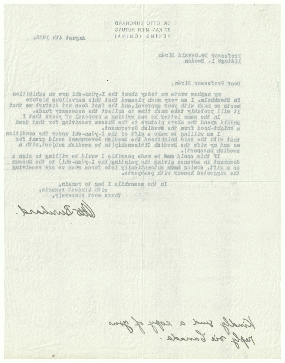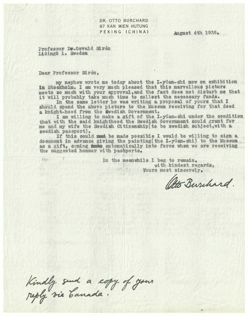 My nephew wrote to me today about the I-yüan-chi painting currently on exhibition in Stockholm. I am very pleased that this marvelous picture meets so much with your approval, and the fact that it will likely take considerable time to gather the necessary funds does not trouble me.