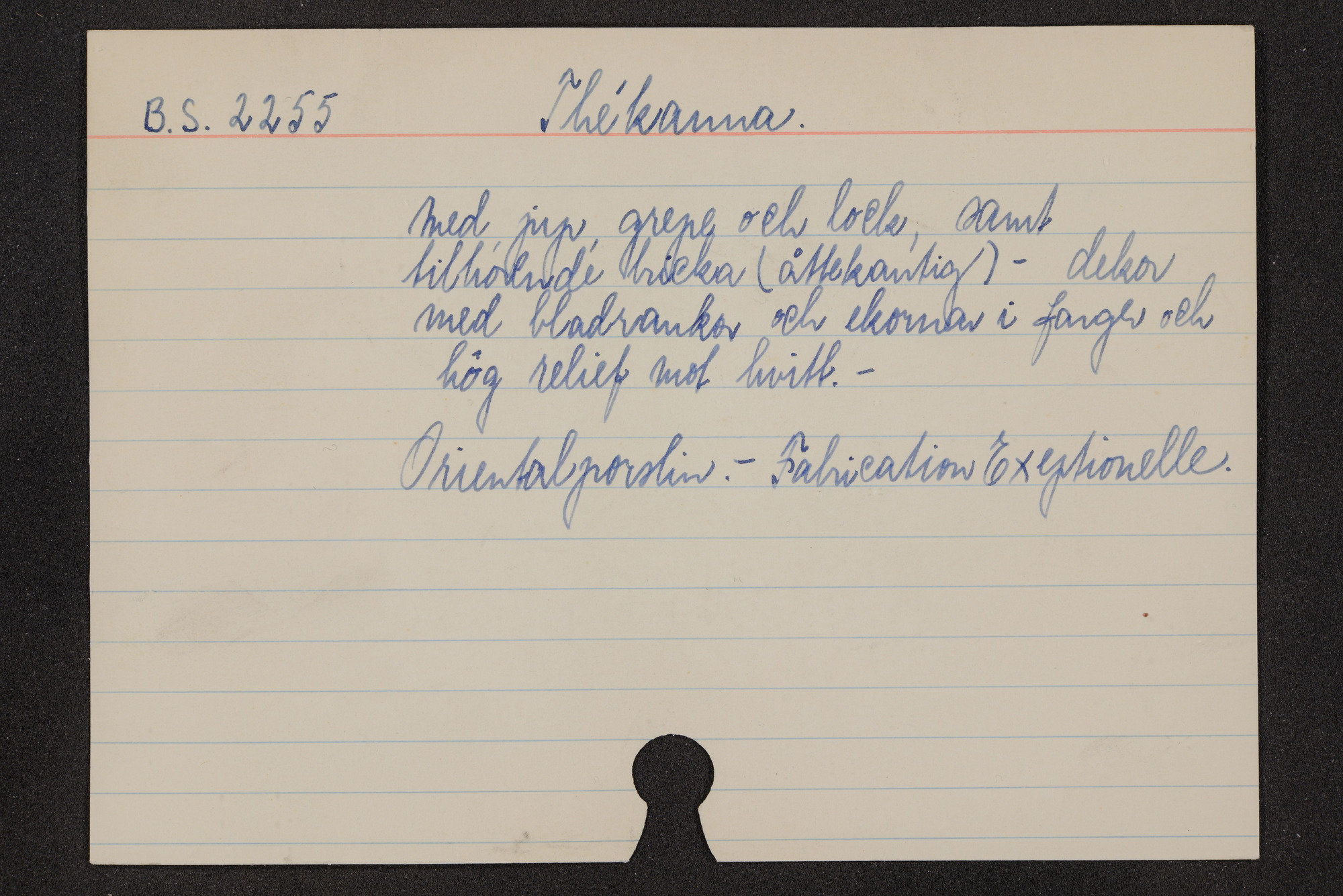 • Katalogkort ur Östasiatiska museets arkiv som beskriver föremål ur samlingarna.