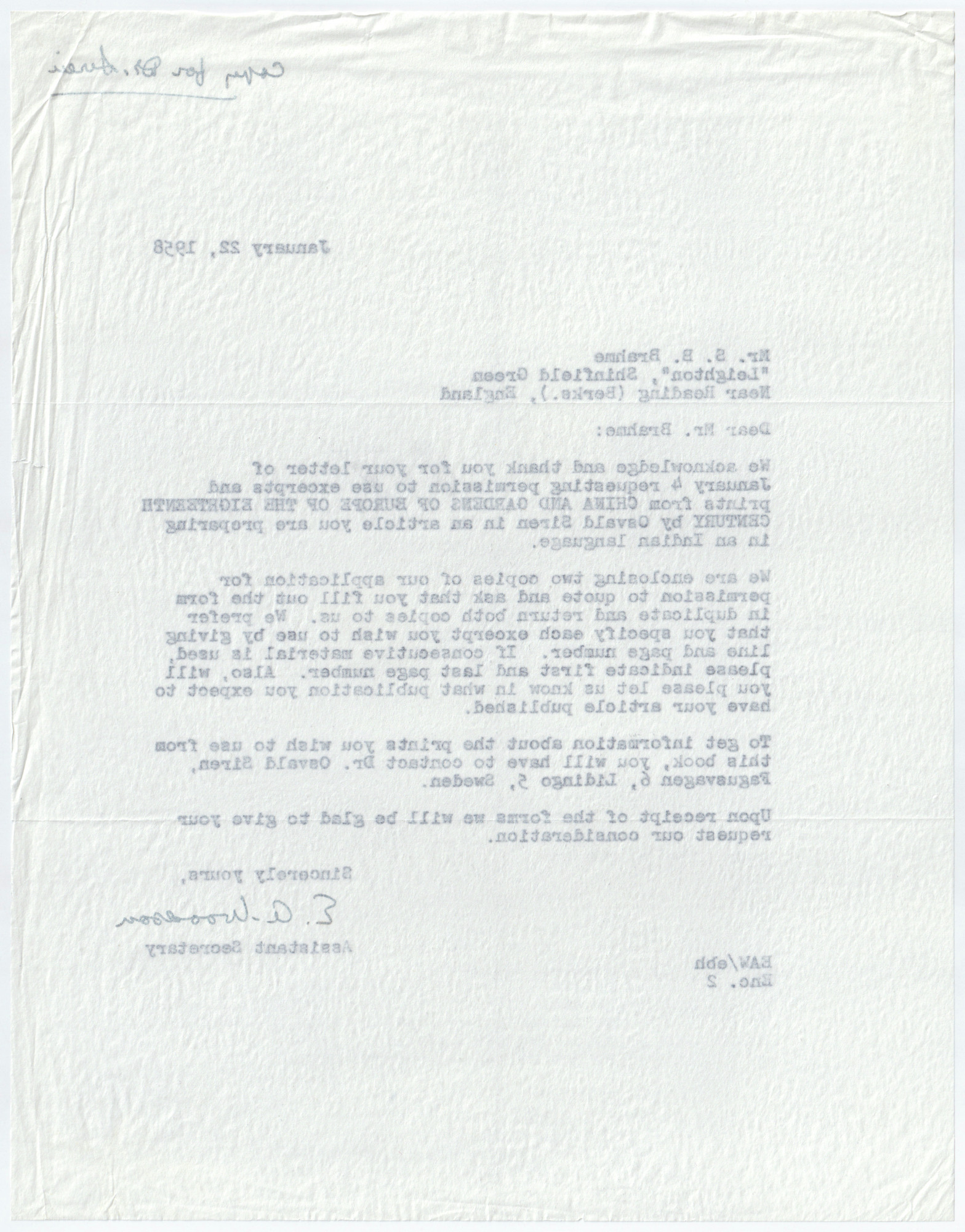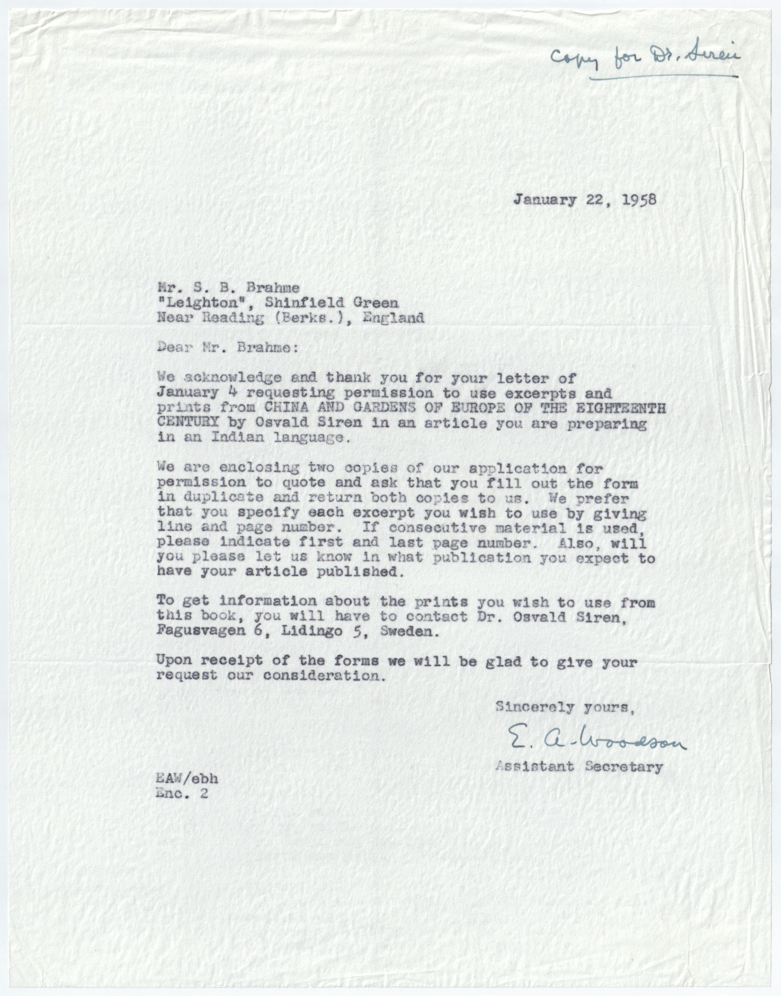 • Kopia av brev till Mr. S. B. Brahme.