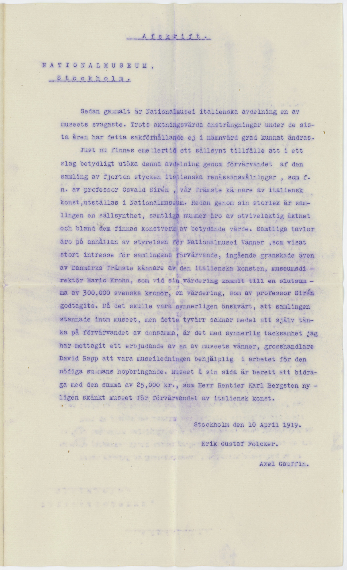 • Tillverkad 1919-04-10 av Nationalmuseum, Stockholm.
