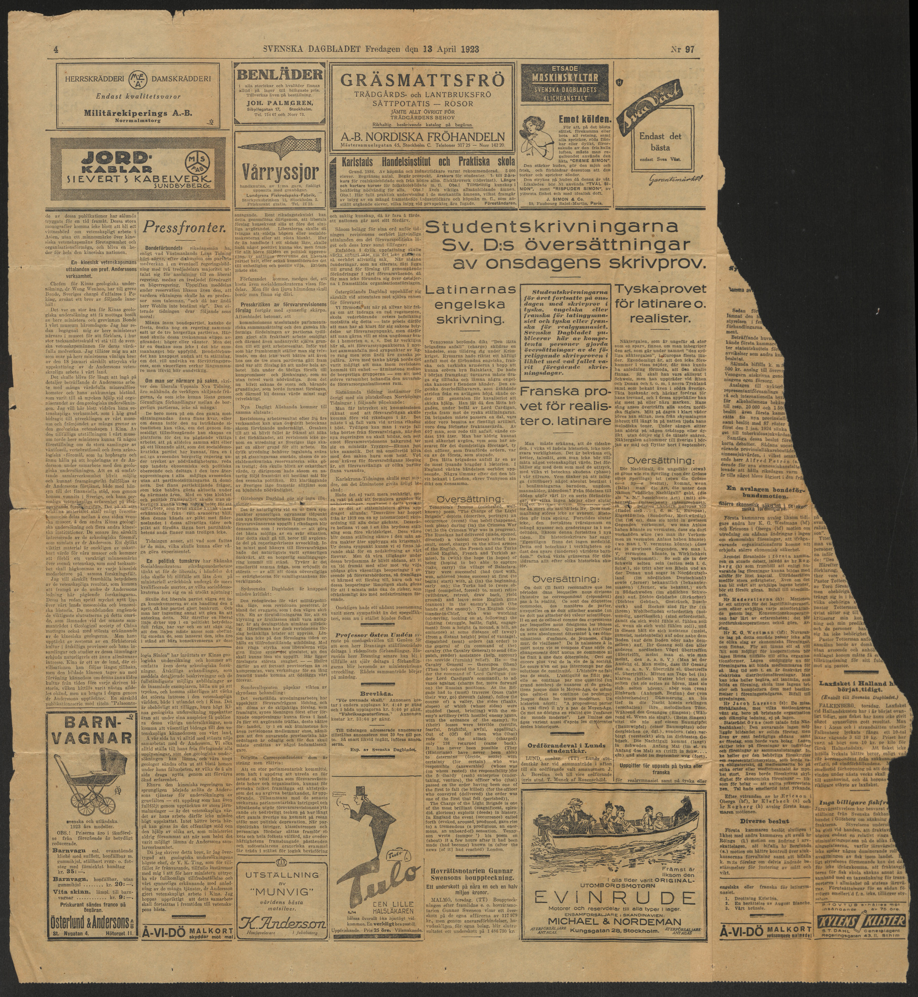 • Sida ur Svenska Dagbladet 1923. Ur mapp med "pass, brev och skrifter på kinesiska, blandade anteckningar".