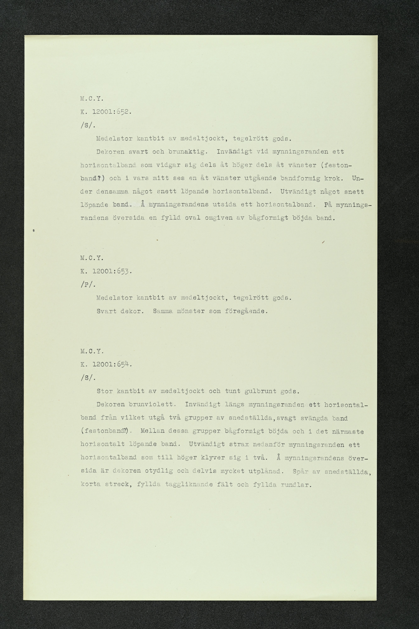 • Ma Chia Yao. Beskrivning av målade keramikskärvor av Nils Palmgren. K 12001: 1-78, 585-929, 1108-1508.