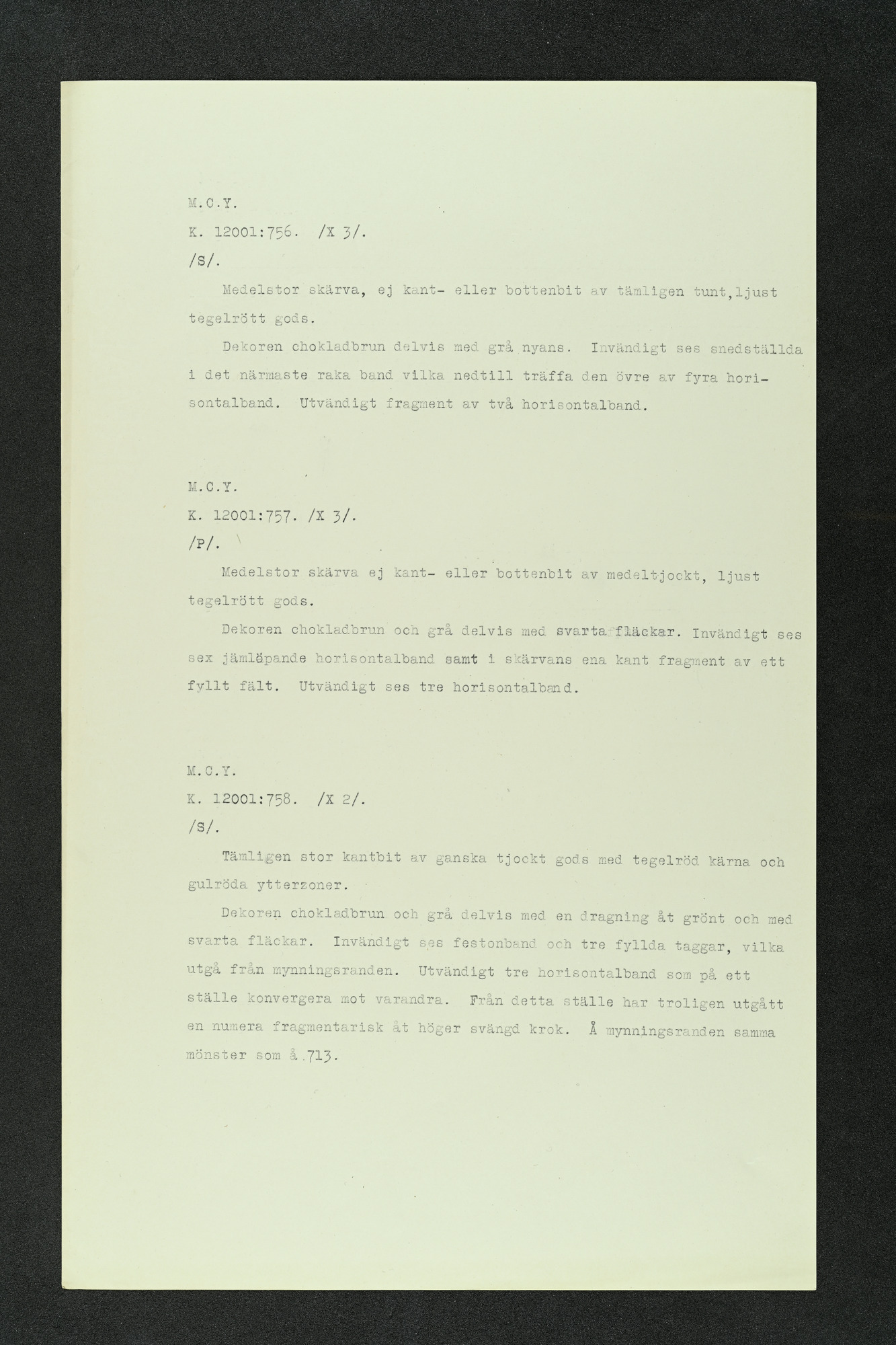 • Ma Chia Yao. Beskrivning av målade keramikskärvor av Nils Palmgren. K 12001: 1-78, 585-929, 1108-1508.