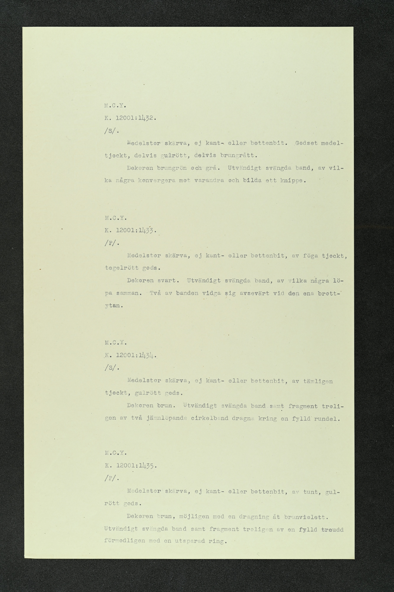 • Ma Chia Yao. Beskrivning av målade keramikskärvor av Nils Palmgren. K 12001: 1-78, 585-929, 1108-1508.